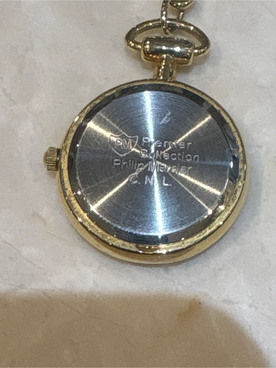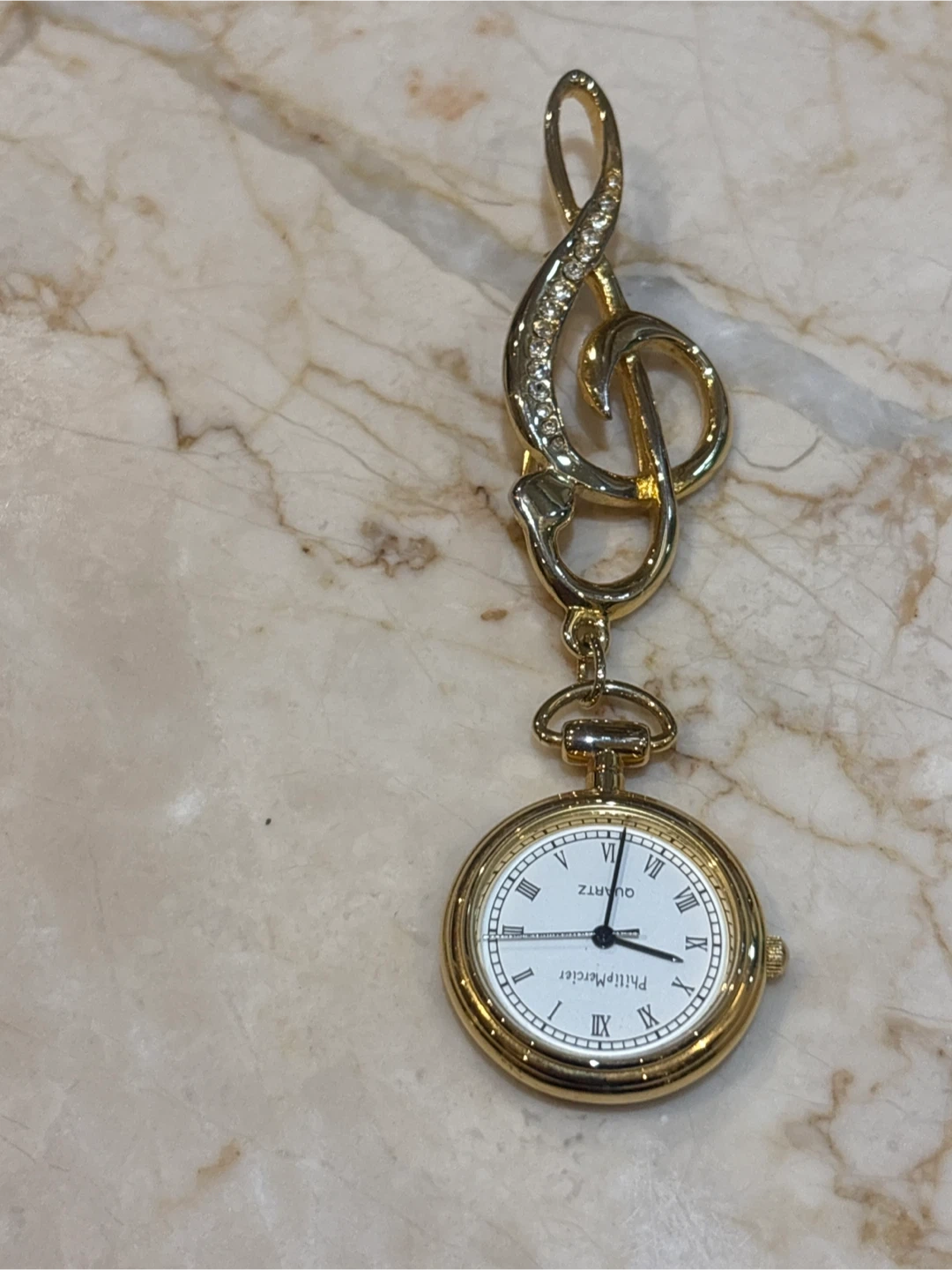 Selling a charming Phillip Mercier pendant watch! This unique timepiece features a gold-tone finish and a decorative music note design. It's in great condition and would make a lovely addition to any jewelry collection