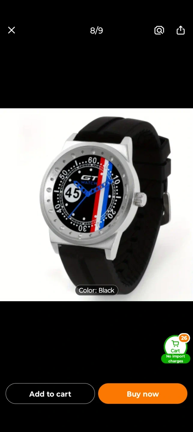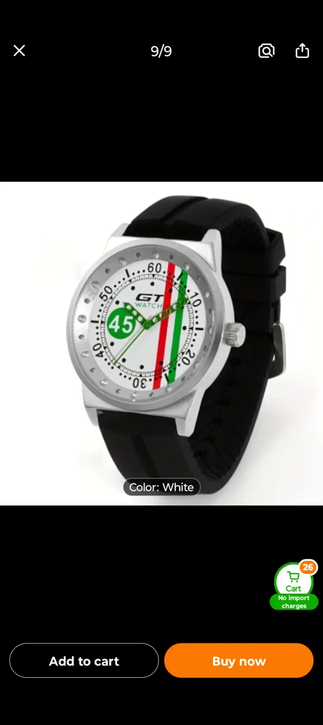 This GT WATCH chronograph watch features a sporty design. It has a black rubber strap and a white face with racing-inspired accents. This watch is great for car enthusiasts! 2 color ways $25 each or 2 for $40