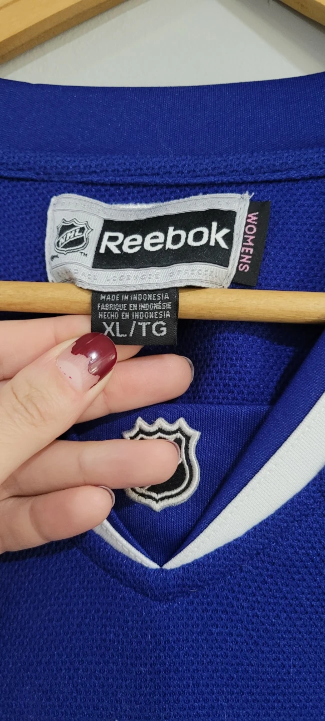 Reebok Women's XL Vancouver Canucks hockey jersey. Blue with green and white stripes. Has the Canucks 'stick in rink' logo on front and shoulder patches. Official NHL licensed jersey.