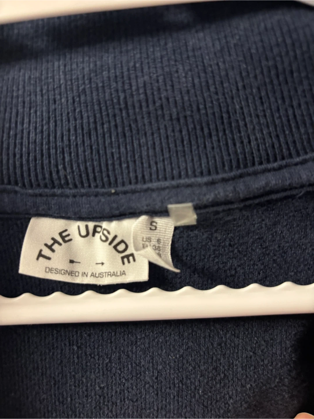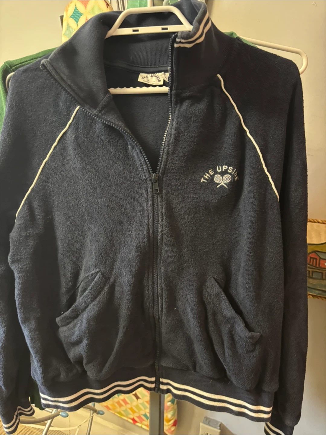 The Upside track jacket in navy blue terry cloth. Features a zip-up front and white piping details. Designed in Australia. Size S.