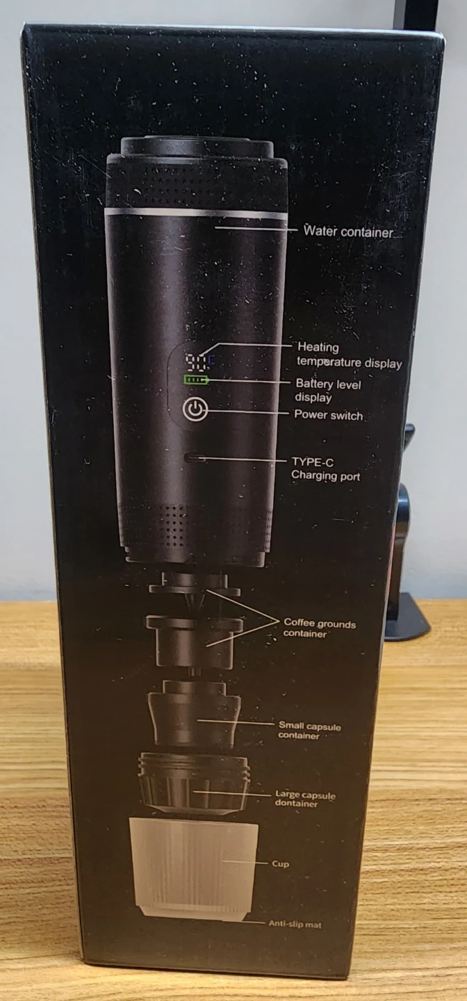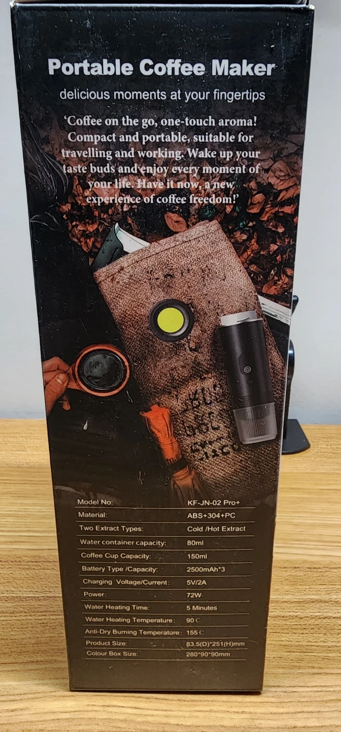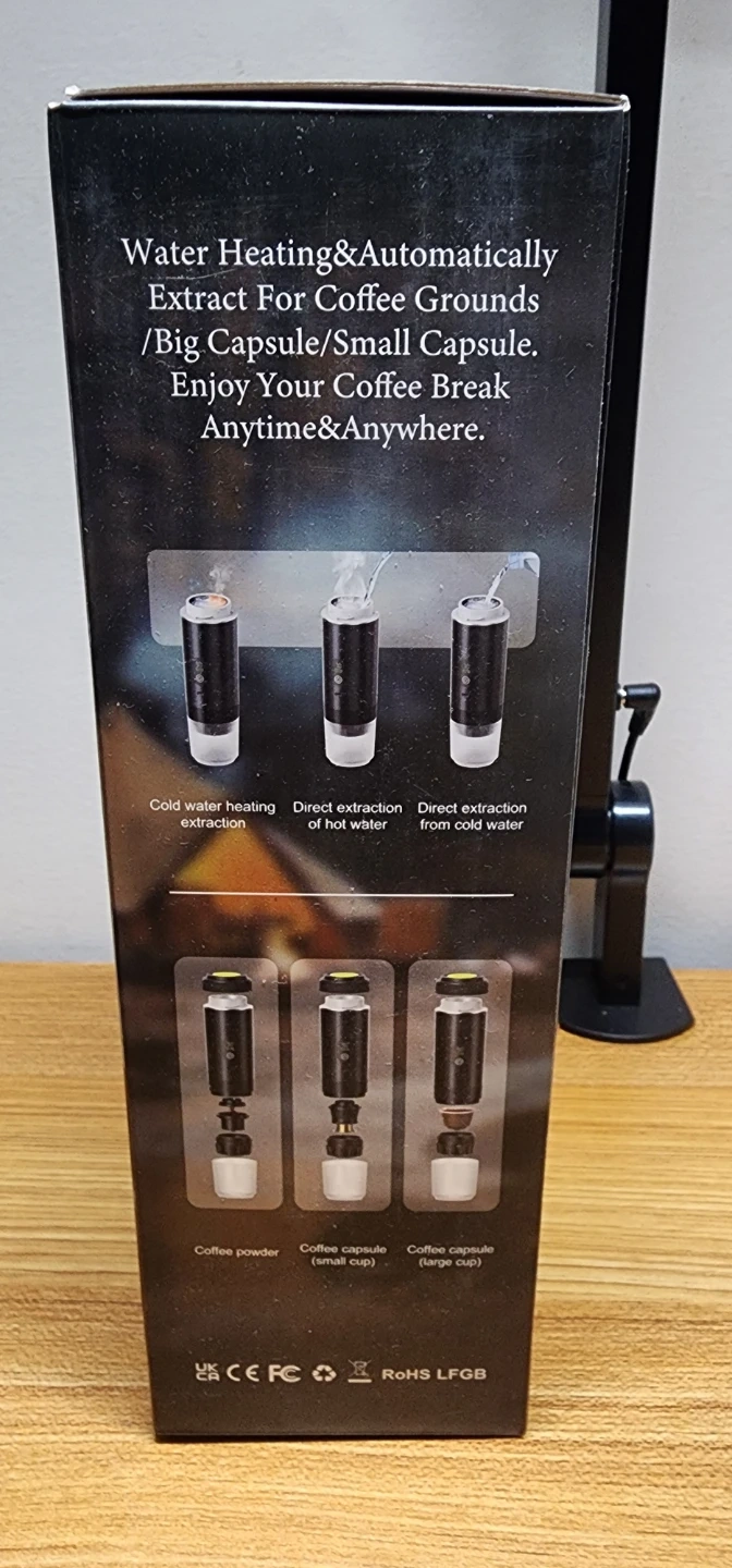 This portable espresso machine is great for making coffee on the go. It can extract using cold water heating or direct extraction of hot water. It's compatible with coffee grounds and both large and small capsules.