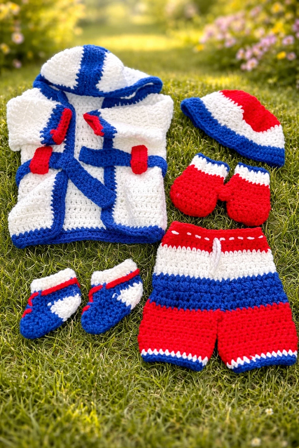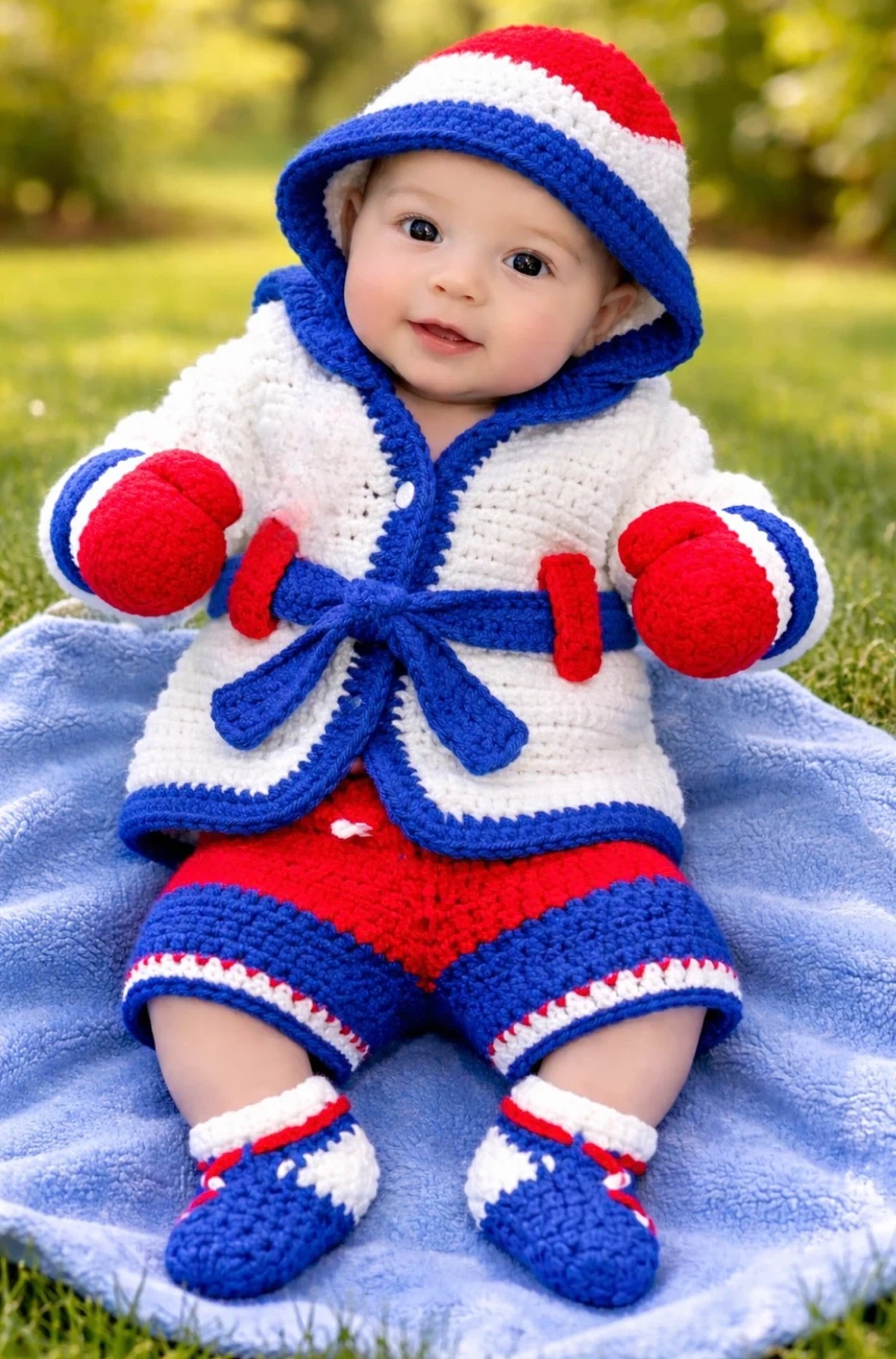 Adorable 5-piece crochet boxer costume set for babies. Includes robe, shorts, hat, mittens, and booties. Perfect for photo shoots or themed parties! Handmade with love and care.