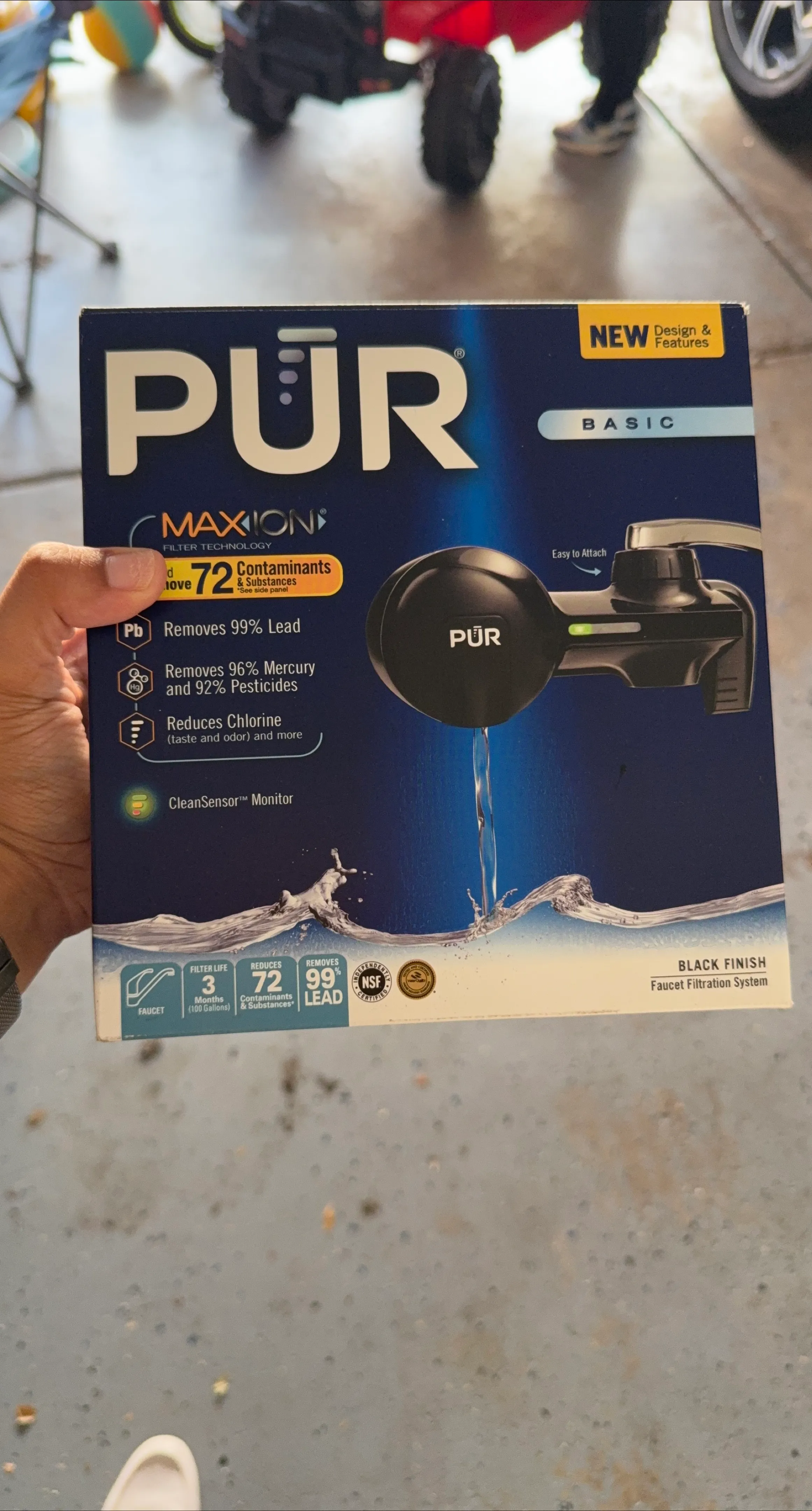 This PUR faucet filtration system comes in a black finish. It uses MAXION filter technology to remove 99% of lead, 96% of mercury, and 92% of pesticides. It also reduces chlorine for better taste and odor. The filter life is 3 months or 100 gallons, and it features a CleanSensor monitor.