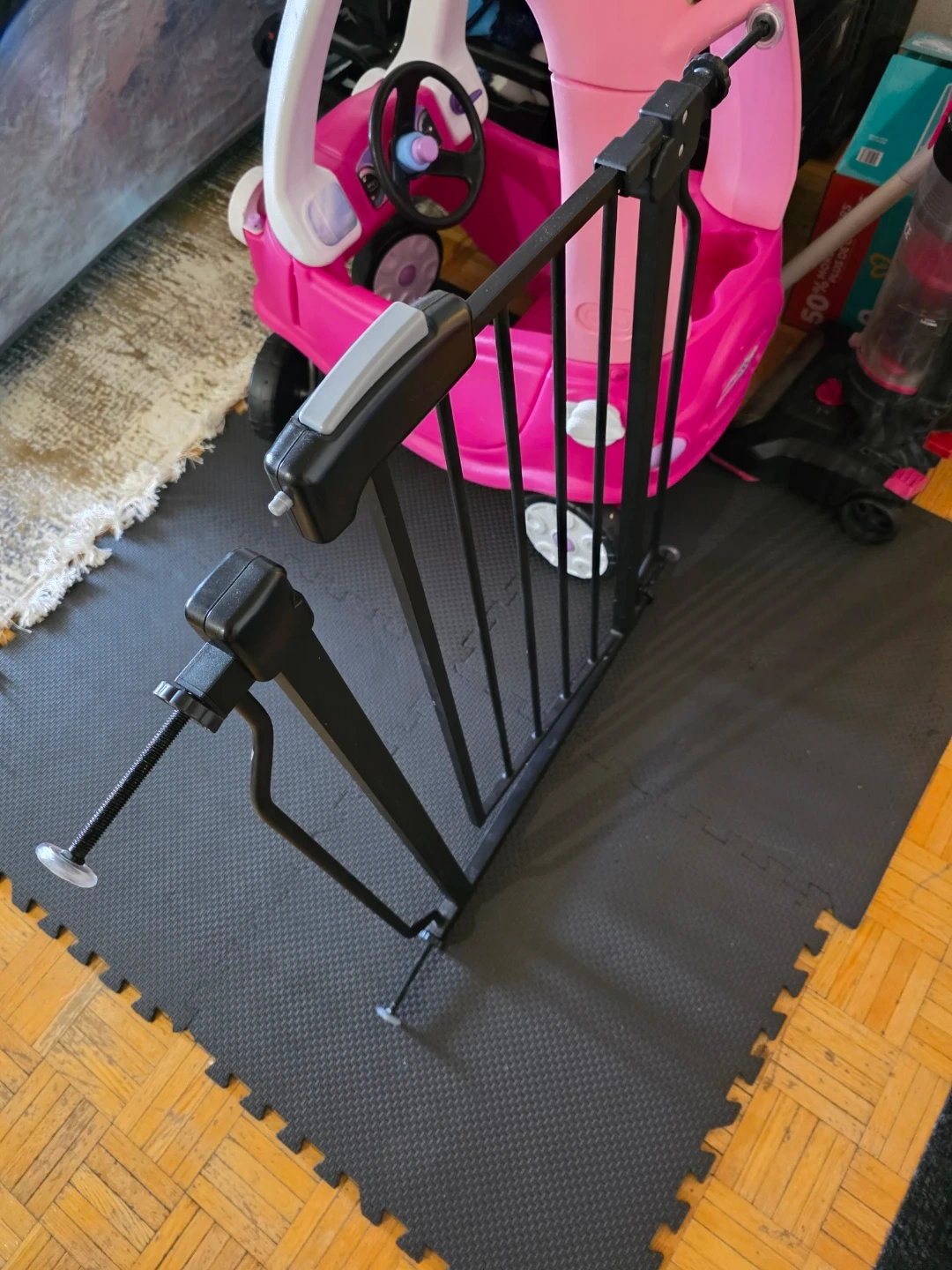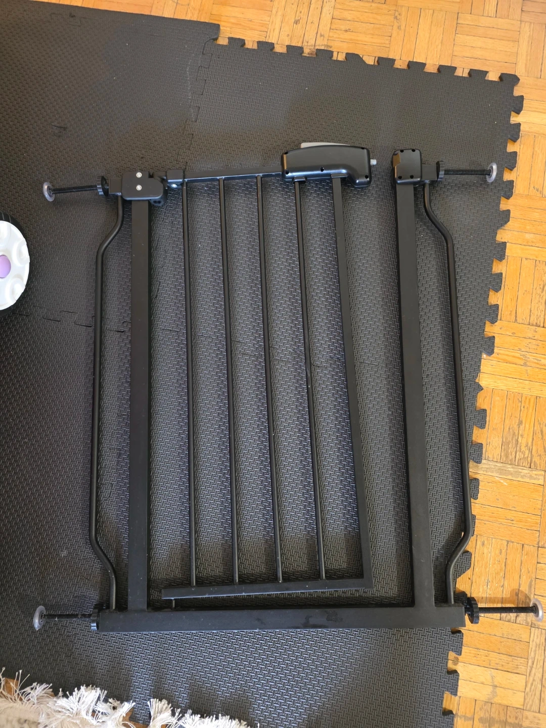 This is a black metal baby safety gate. It's designed to create a barrier in doorways or hallways. The gate has adjustable tension knobs for secure mounting.