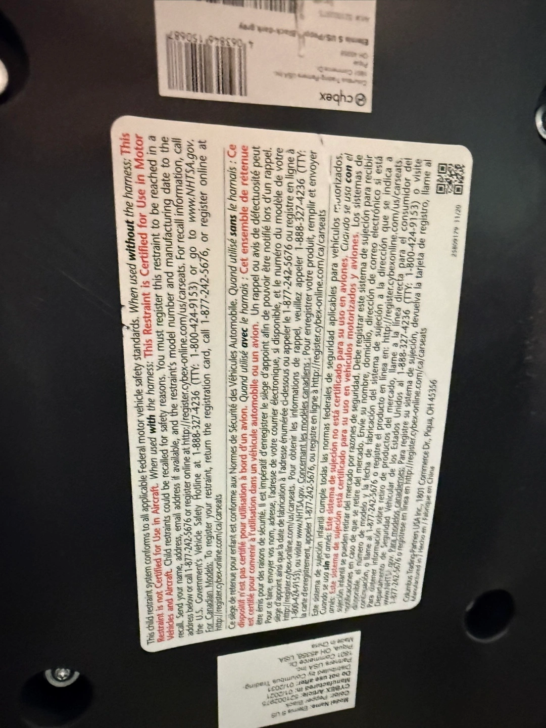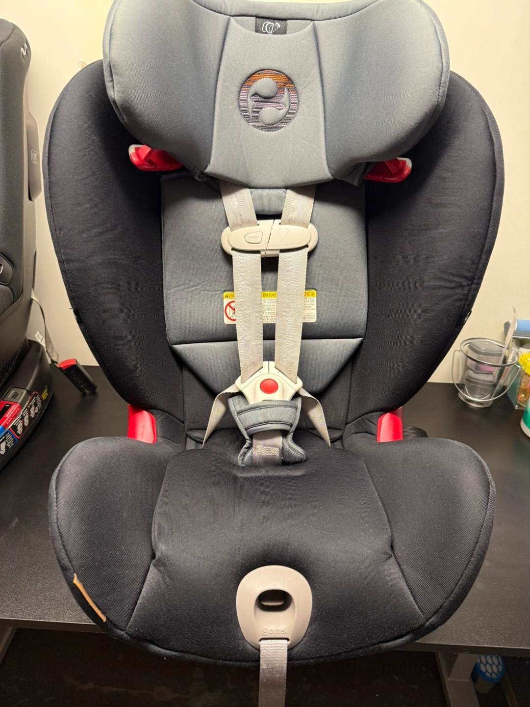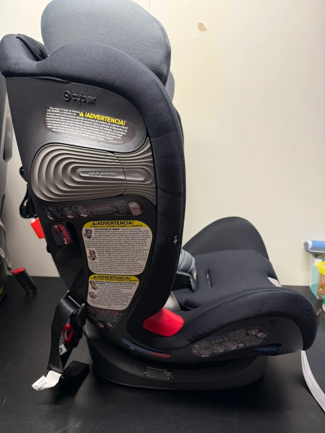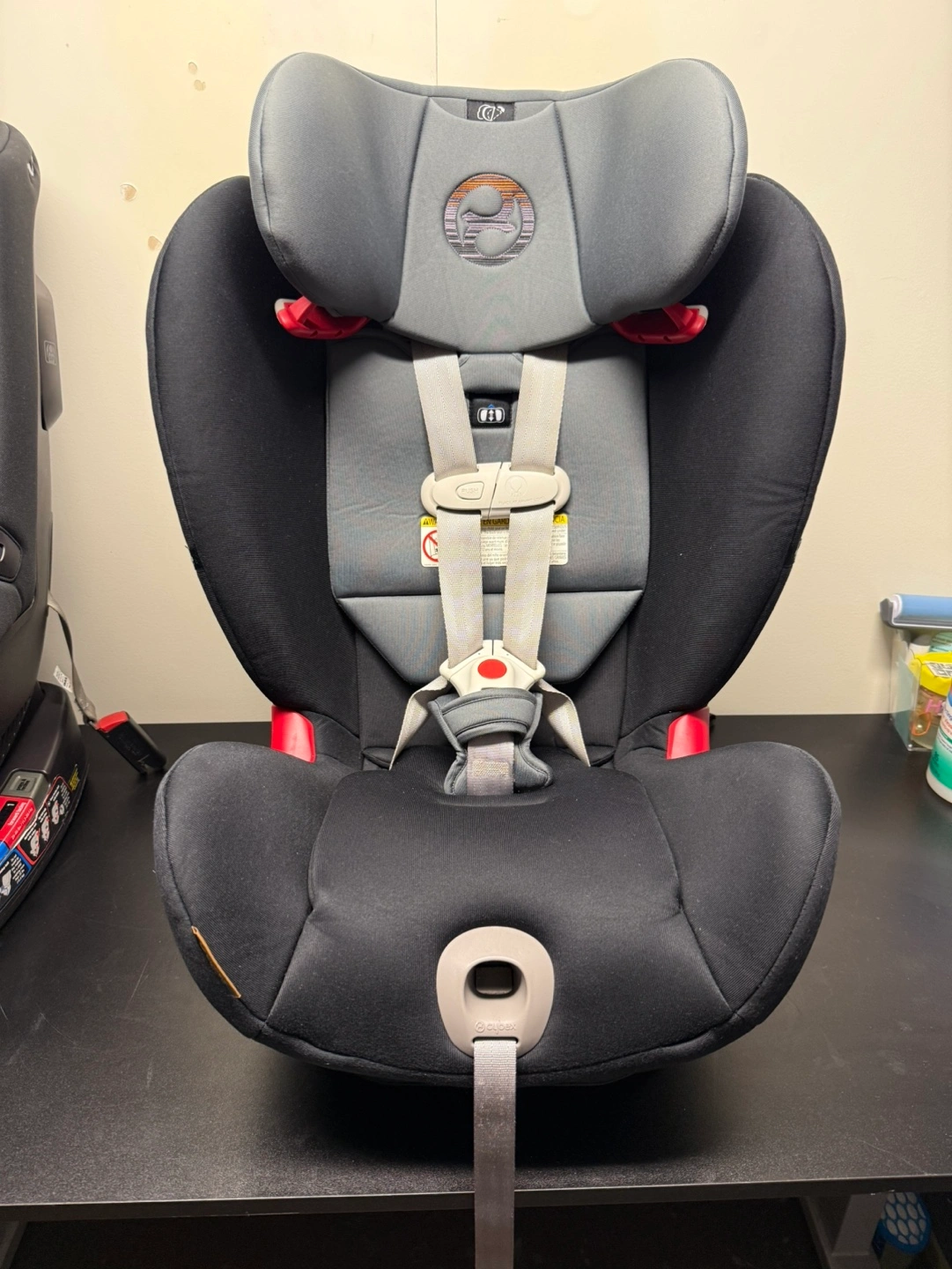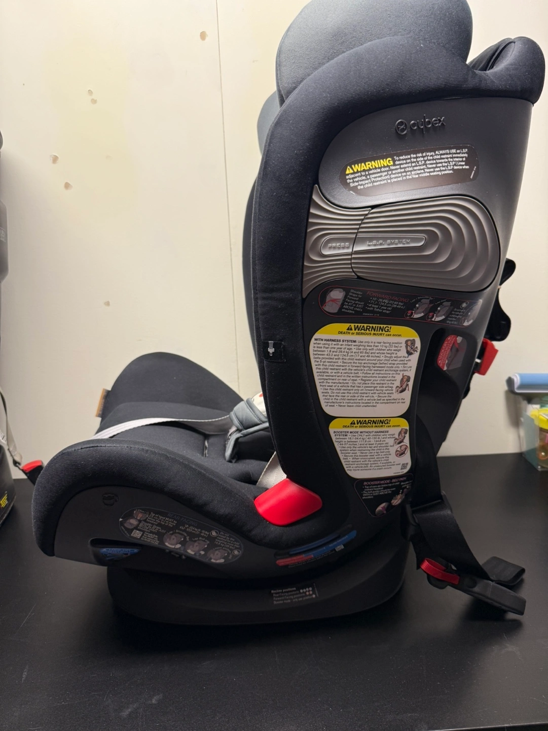 Selling a Cybex car seat in good condition. It's black and gray, ready for a new home!