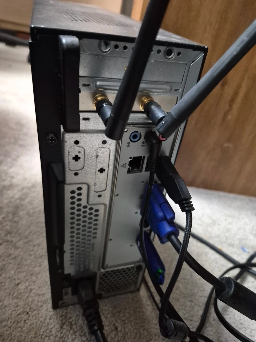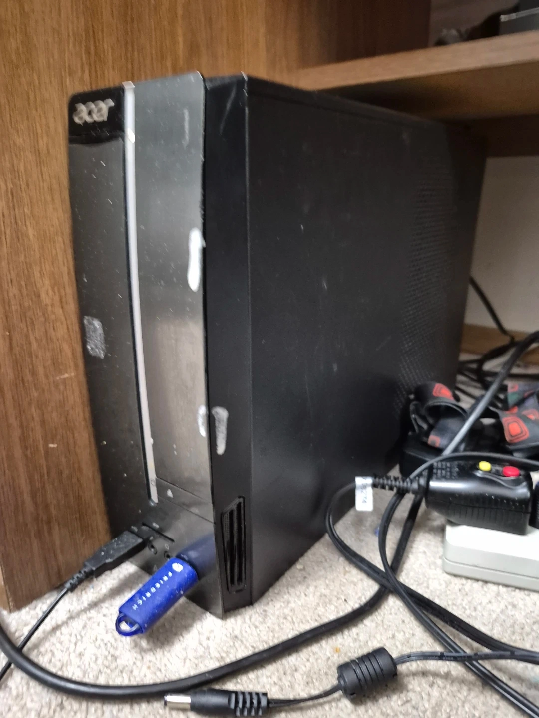 Acer desktop computer in black. This unit has several USB ports and audio jacks visible on the rear. It's suitable for basic computing tasks. Comes with power cables. Running windows 10 with 500Gb HDD 4Gb RAM integrated DVD Player and driver my 48 inch monitor in bedroom.