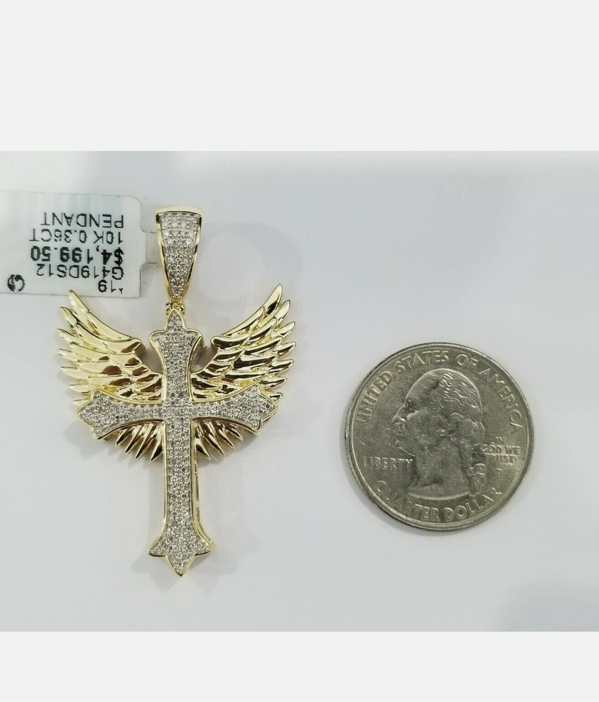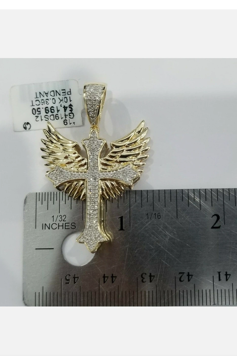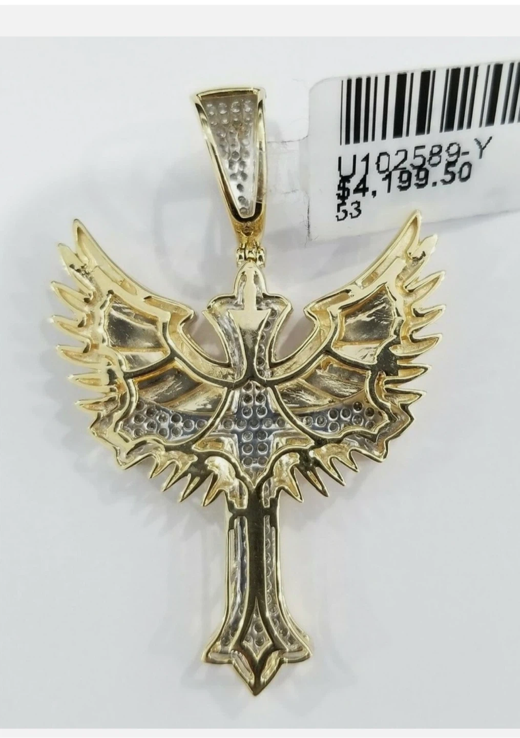 Shiny 10K yellow gold pendant with genuine diamonds. Features an angelic wing design with a cross at its centre. It's approximately 1.5 inches in length.