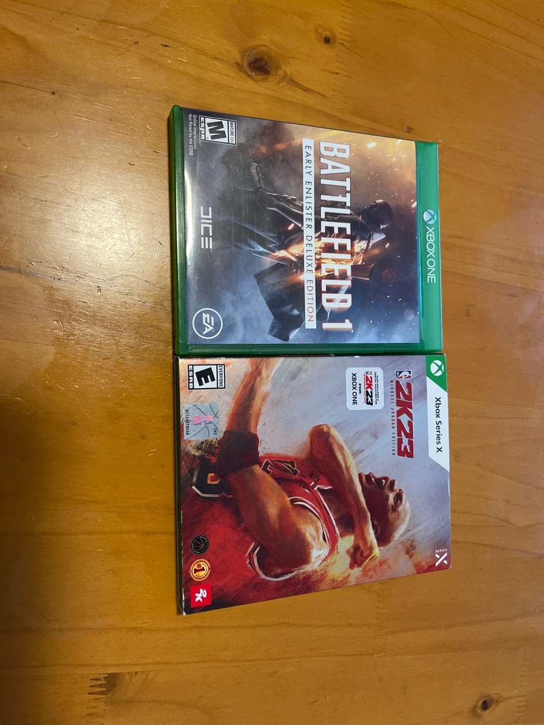 Includes Battlefield 1 Early Enlister Deluxe Edition for Xbox One and NBA 2K23 Michael Jordan Edition for Xbox Series X. Both games come in their original cases.