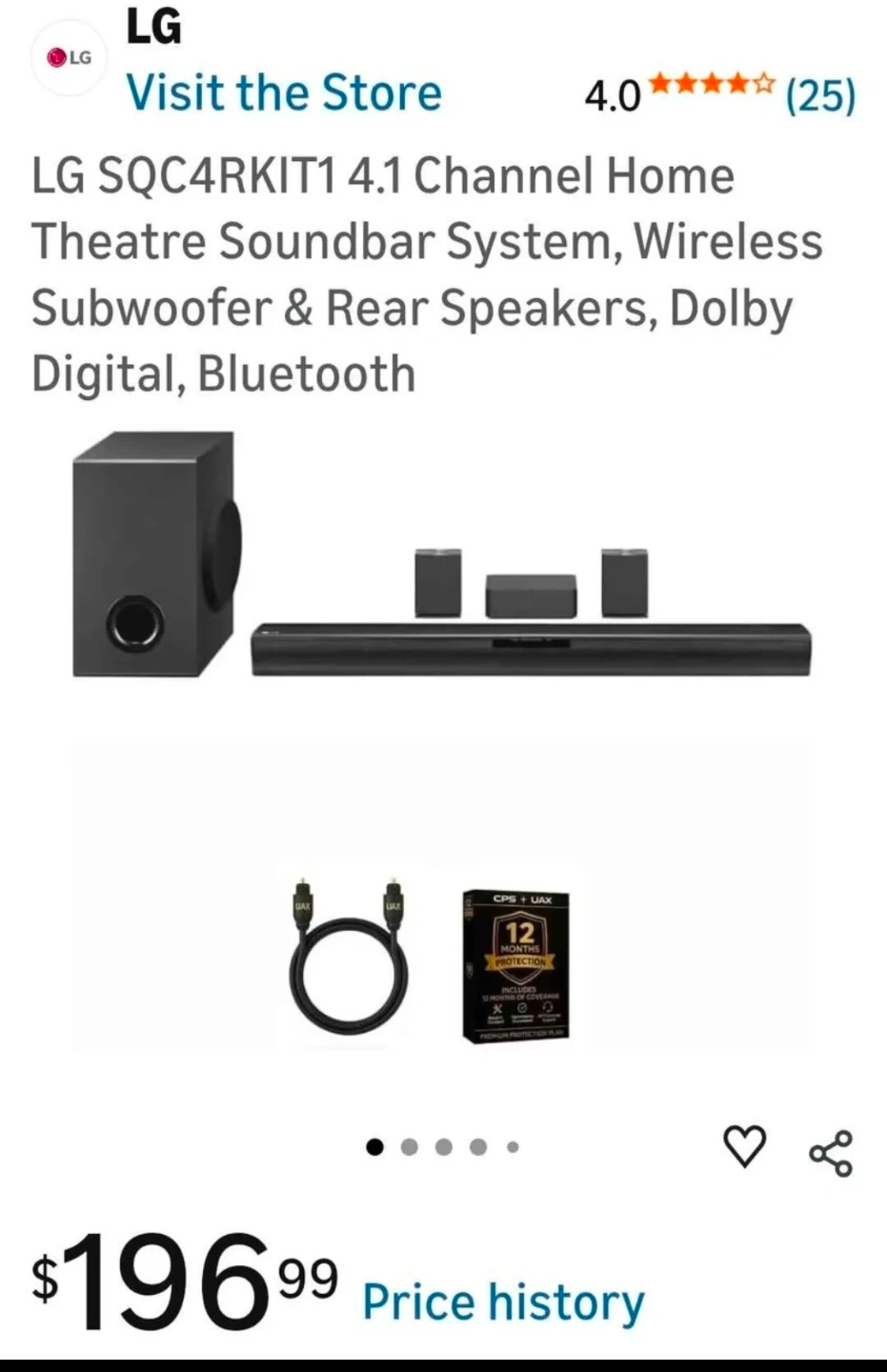 LG SQC4RKIT1 4.1 channel home theatre soundbar system with wireless subwoofer and rear speakers. Includes Dolby Digital and Bluetooth. It's a black system.