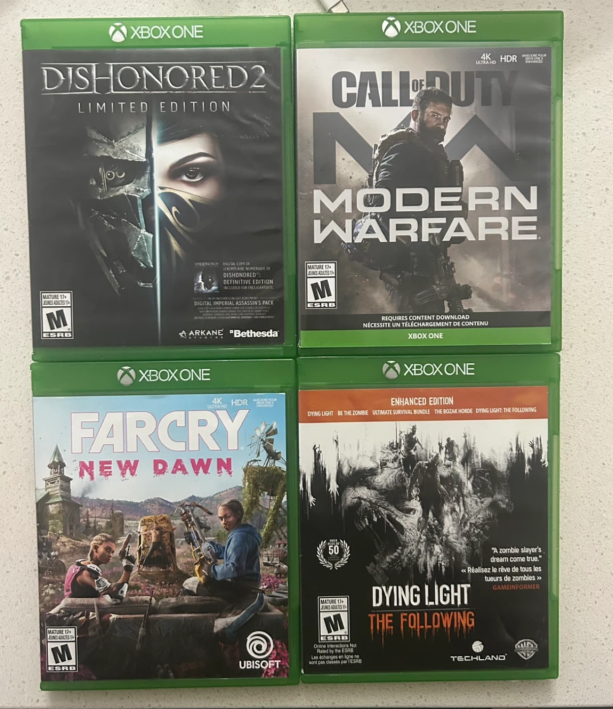 Four Xbox One games included are Dishonored 2 Limited Edition, Call of Duty: Modern Warfare, Far Cry: New Dawn, and Dying Light: The Following Enhanced Edition. These are all rated Mature 17+. They require Xbox One.