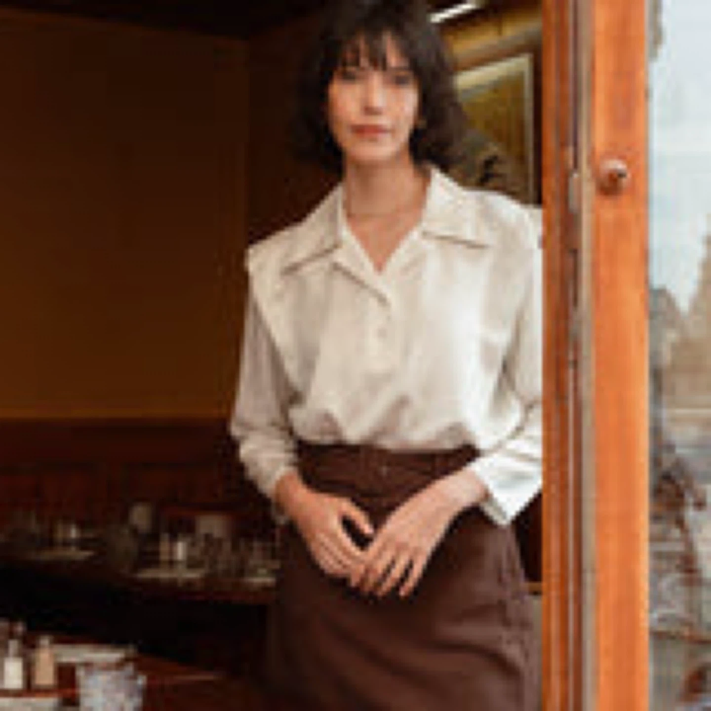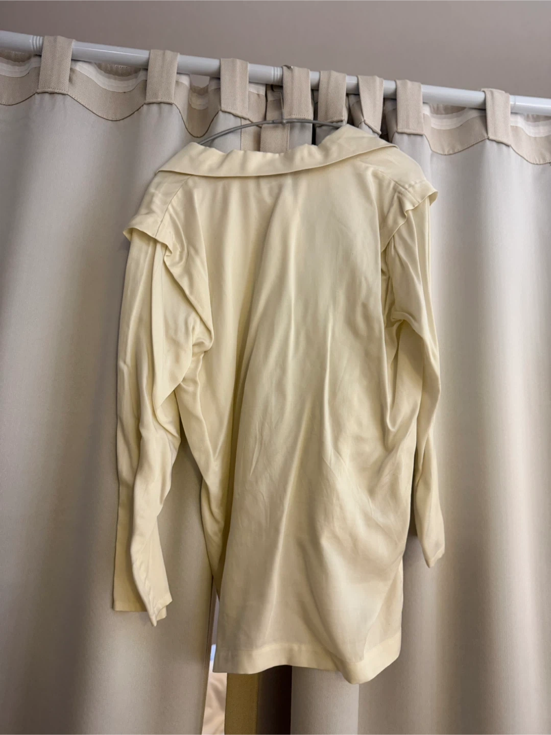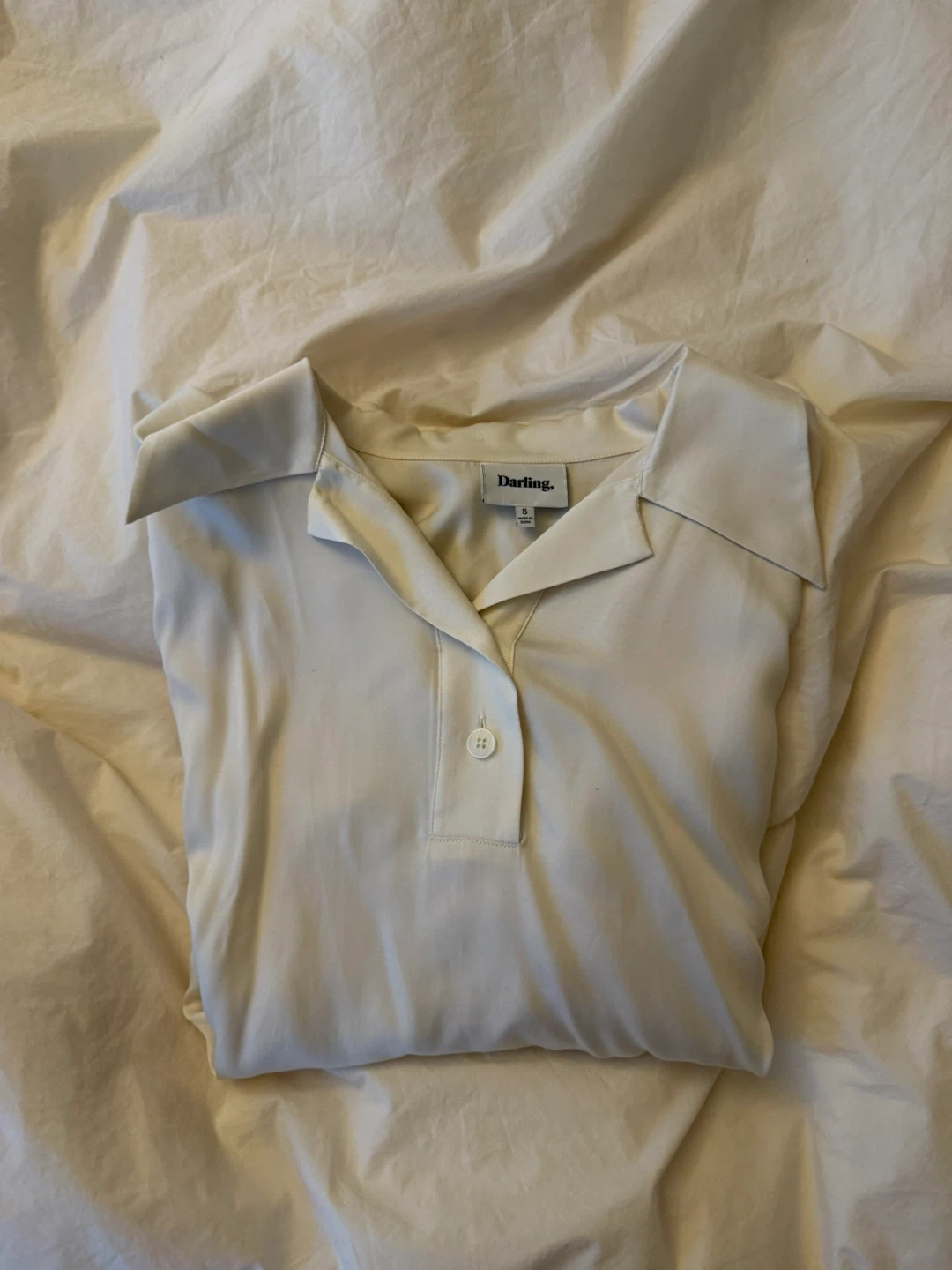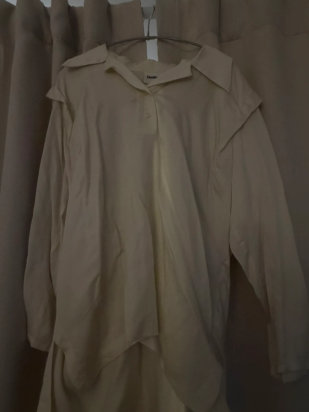 Selling a Darling cream-colored blouse in size small! It's in great condition and ready for a new wardrobe. The blouse features a unique design with a collared neckline and a button-up front. Perfect for adding a touch of elegance to any outfit