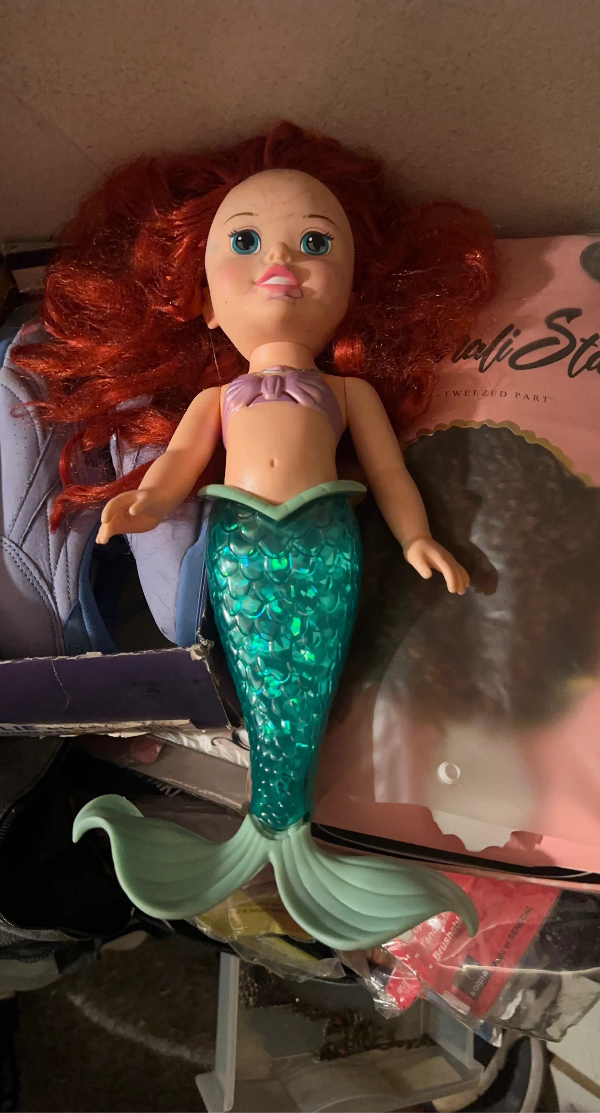 This is a Disney Ariel mermaid doll with bright red hair and a sparkly green tail. She's wearing a purple seashell top. This doll is ready for underwater adventures!