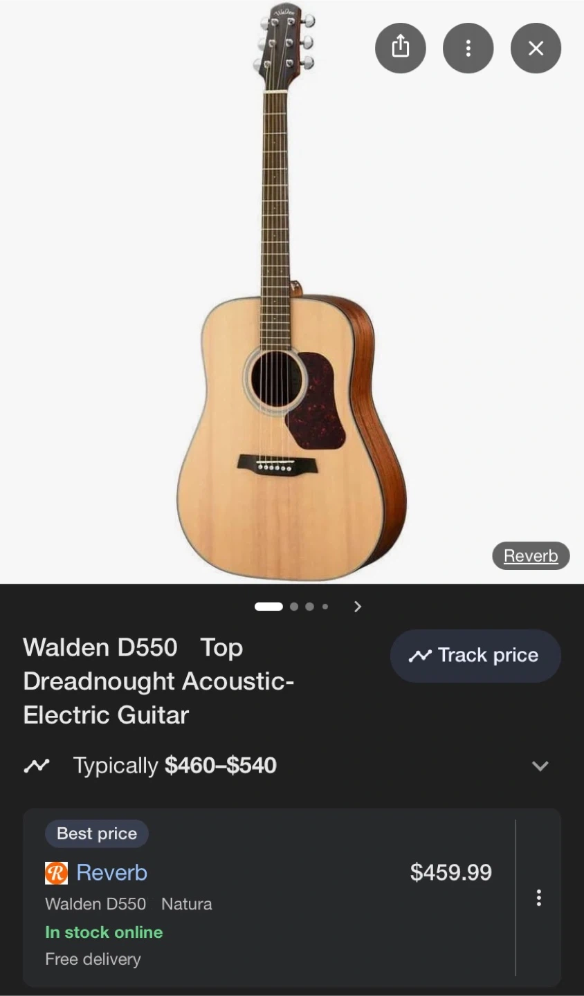 Hard to find a nice solid top acoustic at this price range. Rare tobacco sunburst finish colour.