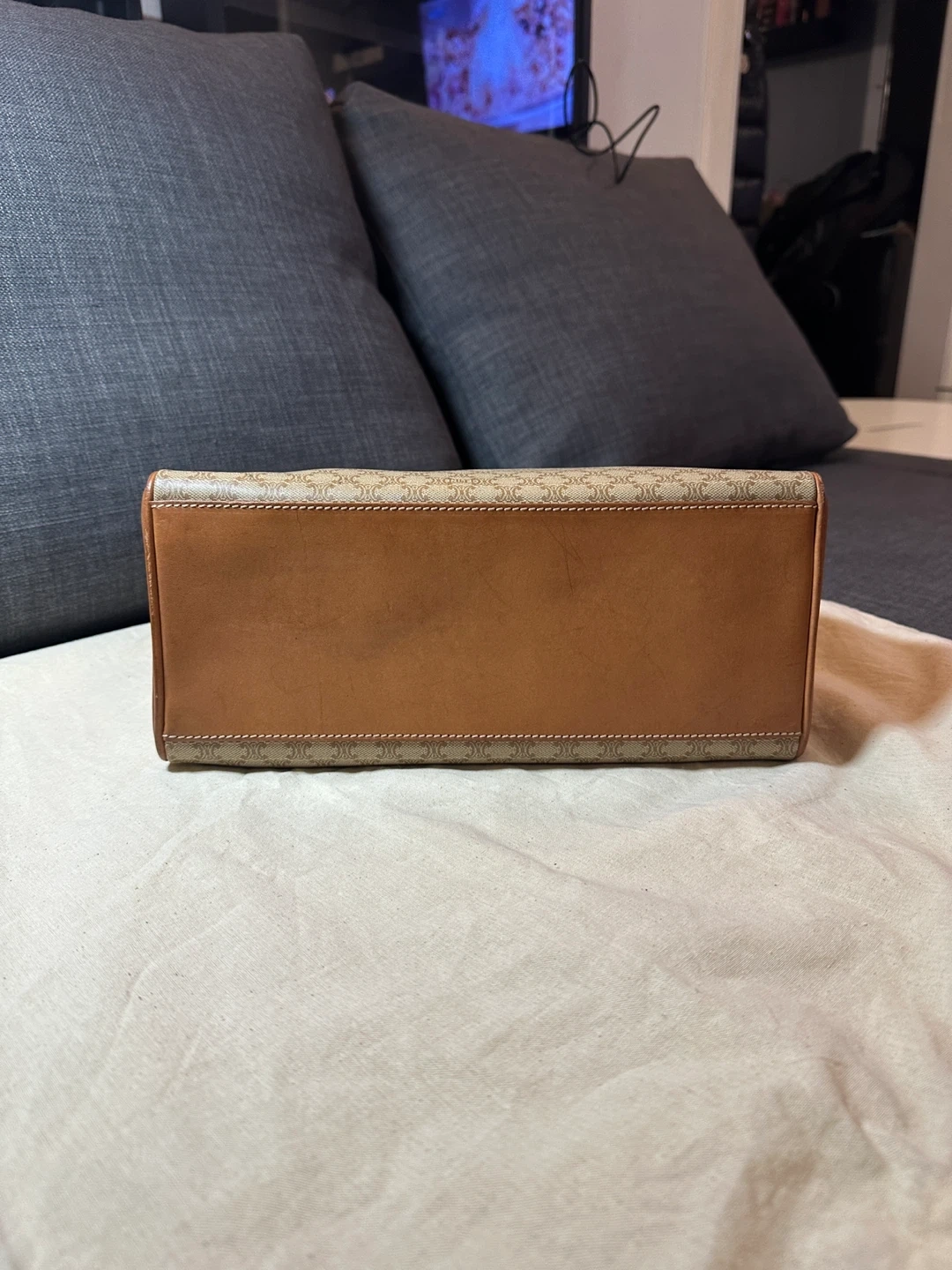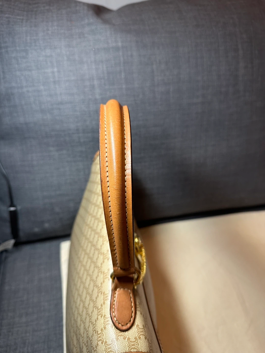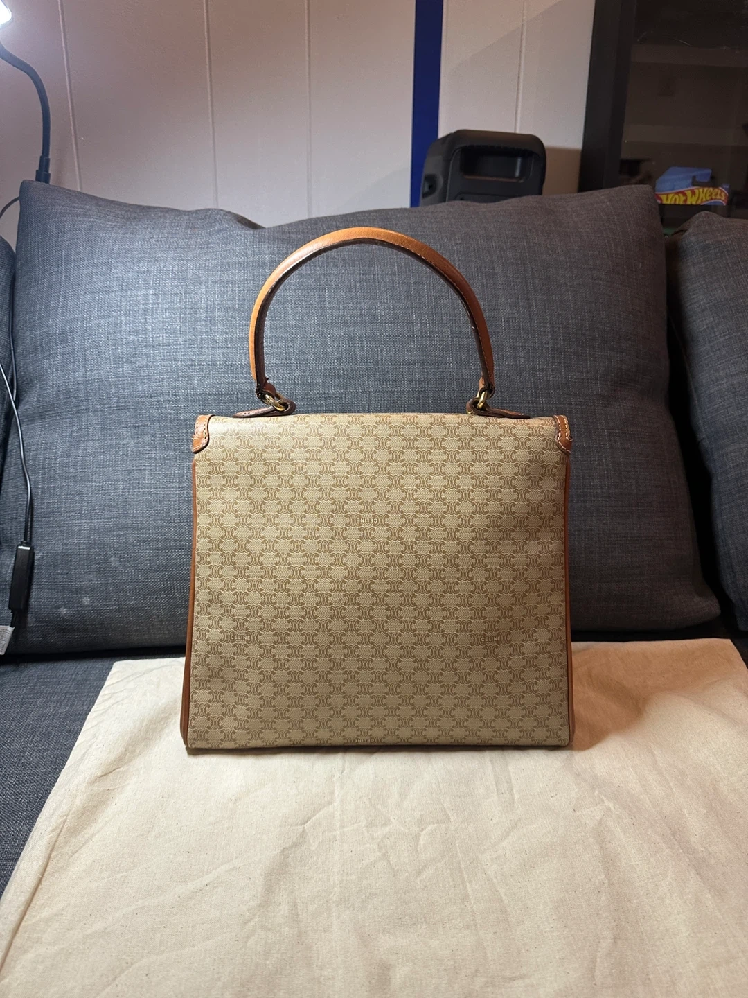 A classic CELINE shoulder bag crafted from durable Triomphe canvas. It features the iconic CELINE monogram print and leather trim. The interior is lined and includes a zip pocket. This bag's structured design makes it suitable for everyday use.