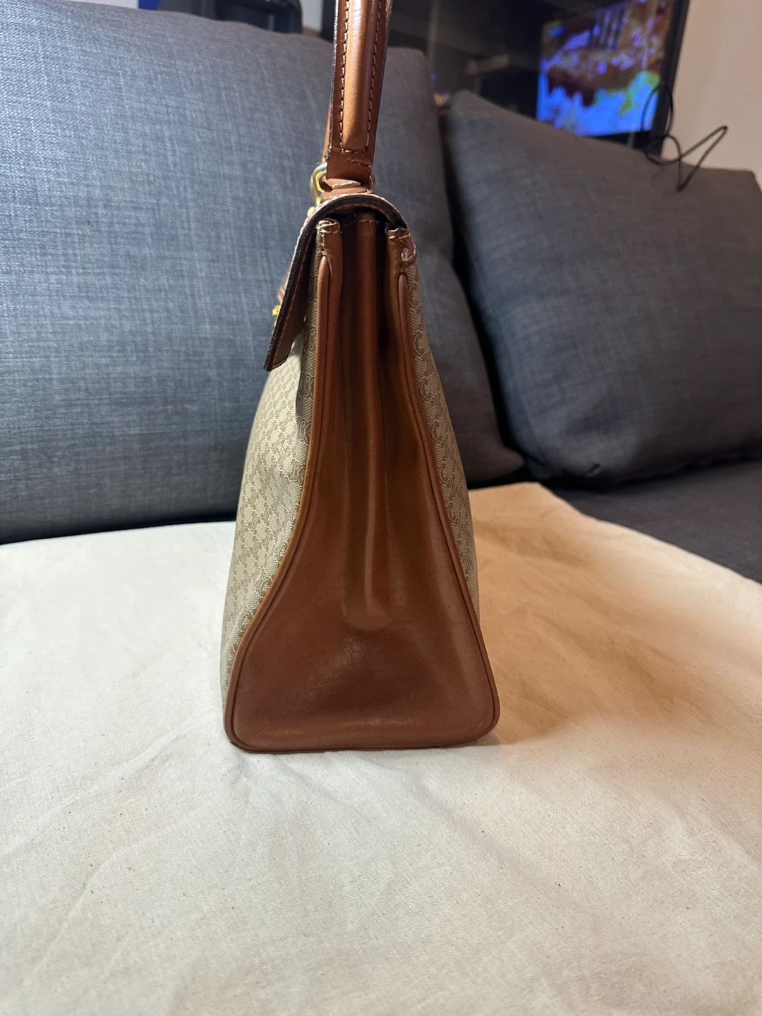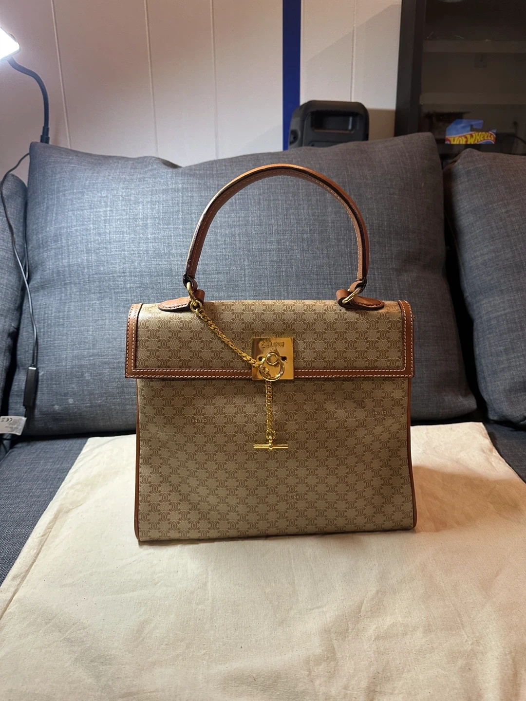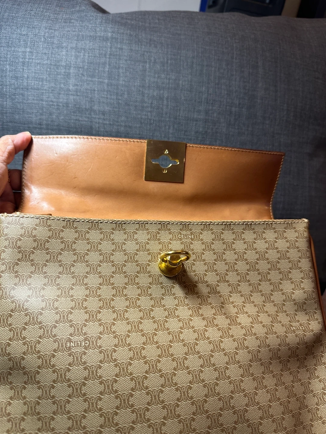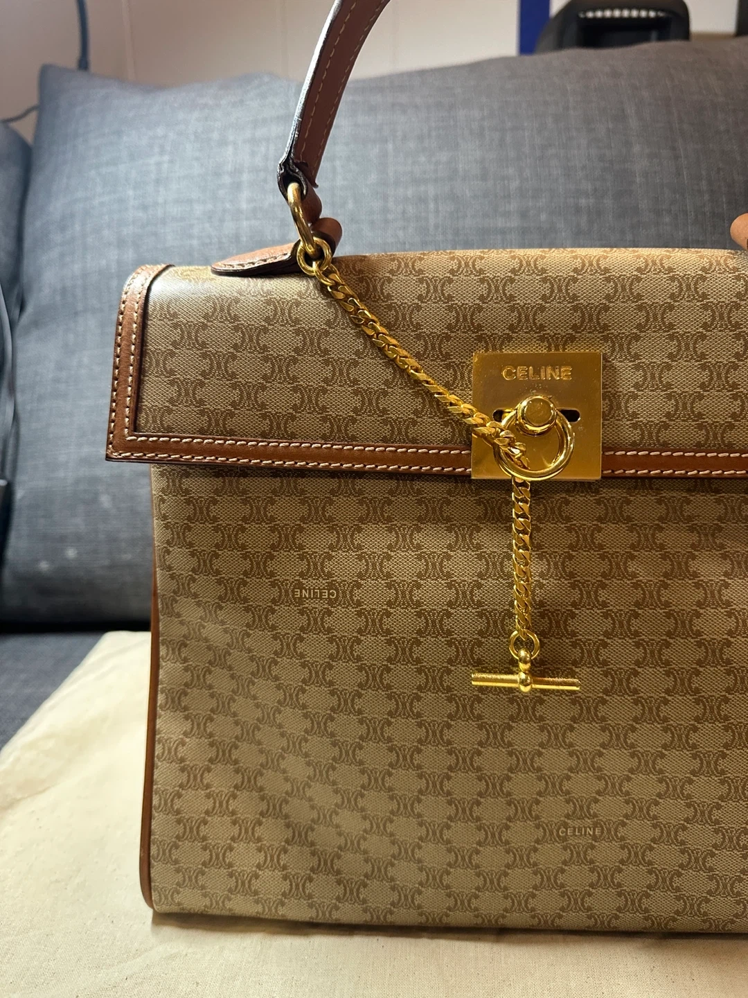 A classic CELINE shoulder bag crafted from durable Triomphe canvas. It features the iconic CELINE monogram print and leather trim. The interior is lined and includes a zip pocket. This bag's structured design makes it suitable for everyday use.