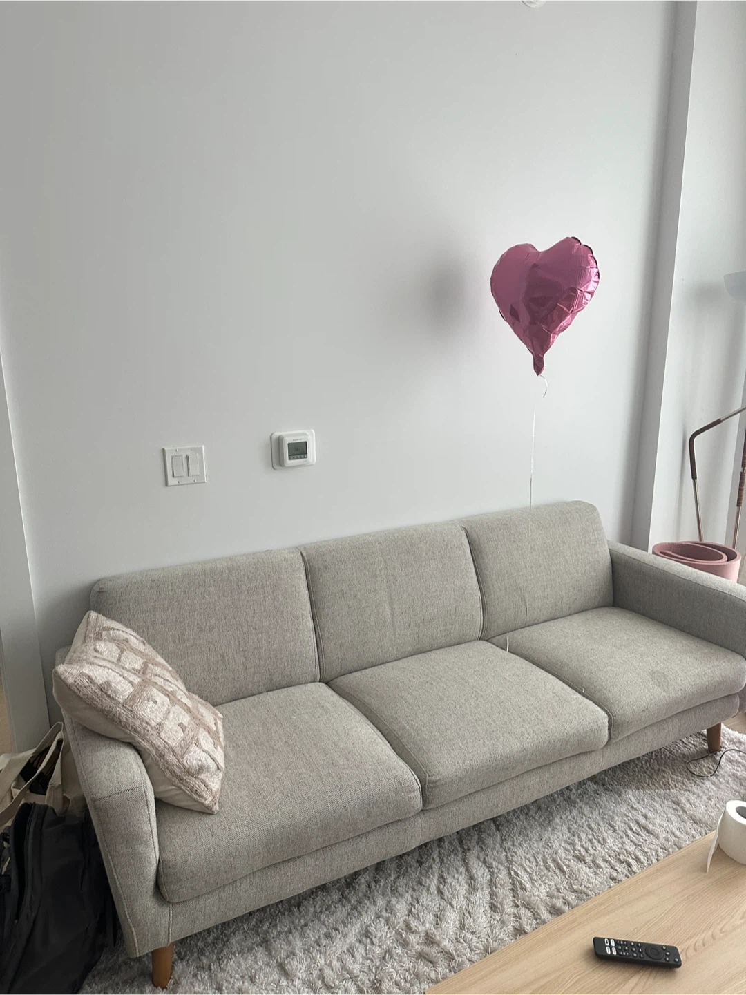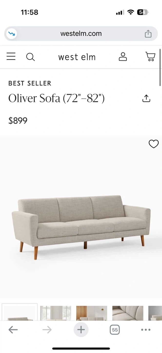 This is a West Elm Oliver Sofa in a light beige fabric. It's a 72"-82" size. The sofa has three seat cushions and a clean, modern design with wooden legs.