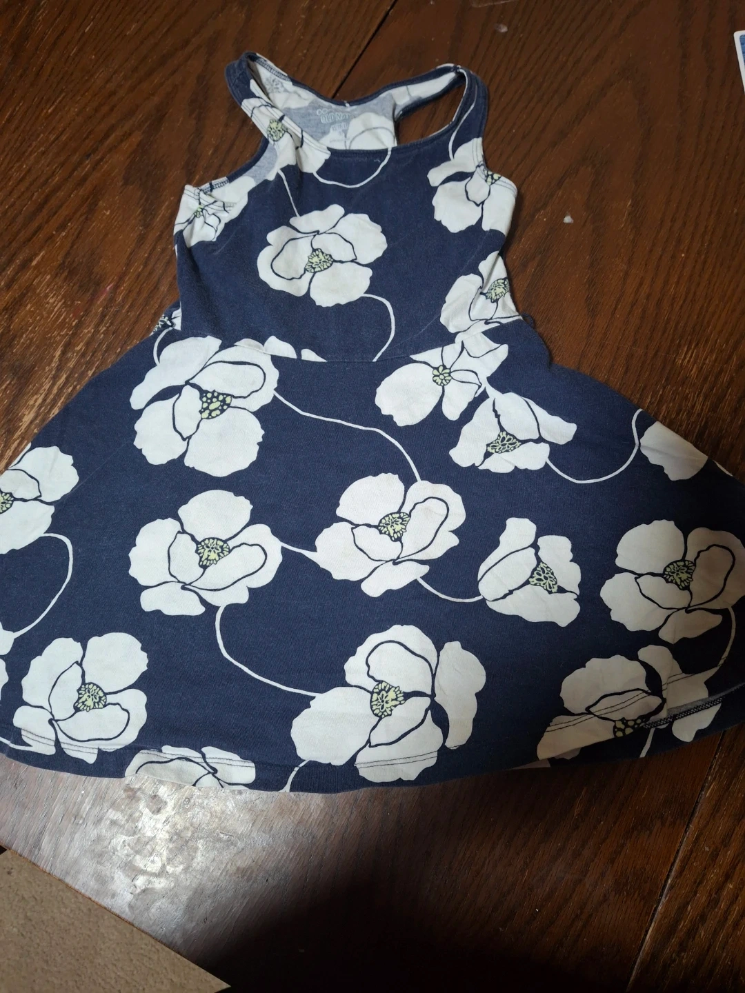 Old Navy girls sleeveless dress with a navy blue background and a white floral print. It's a cute sundress perfect for warm weather. Material is a soft knit. Size 5T