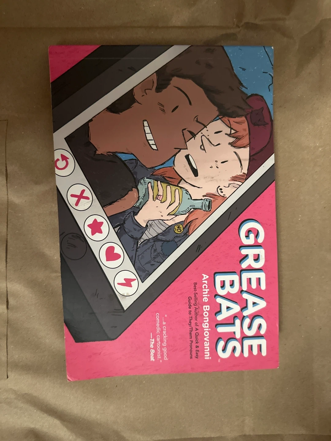 This is the graphic novel 'Grease Bats' by Archie Bongiovanni. It's described as a cracking good comedic cartoonist's work. This book is a guide to they/them pronouns.