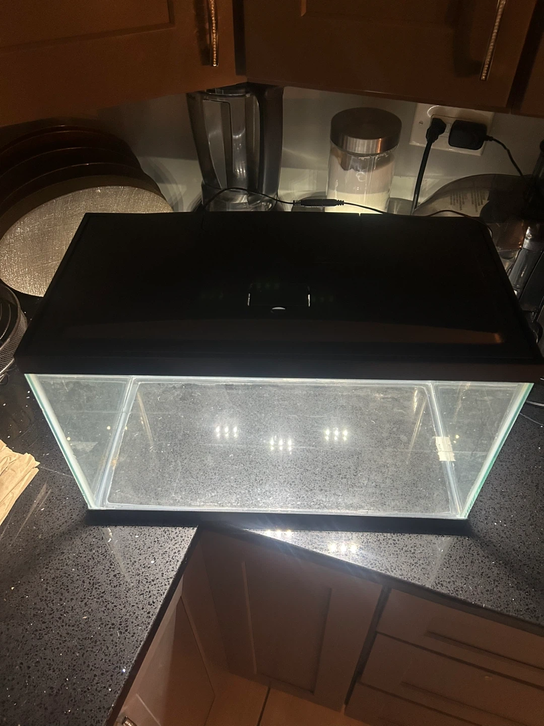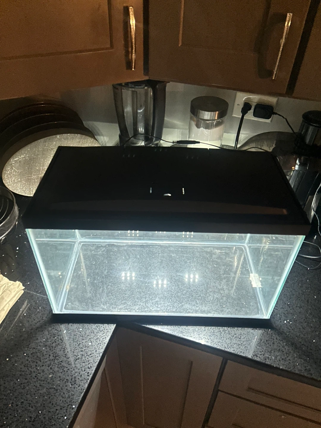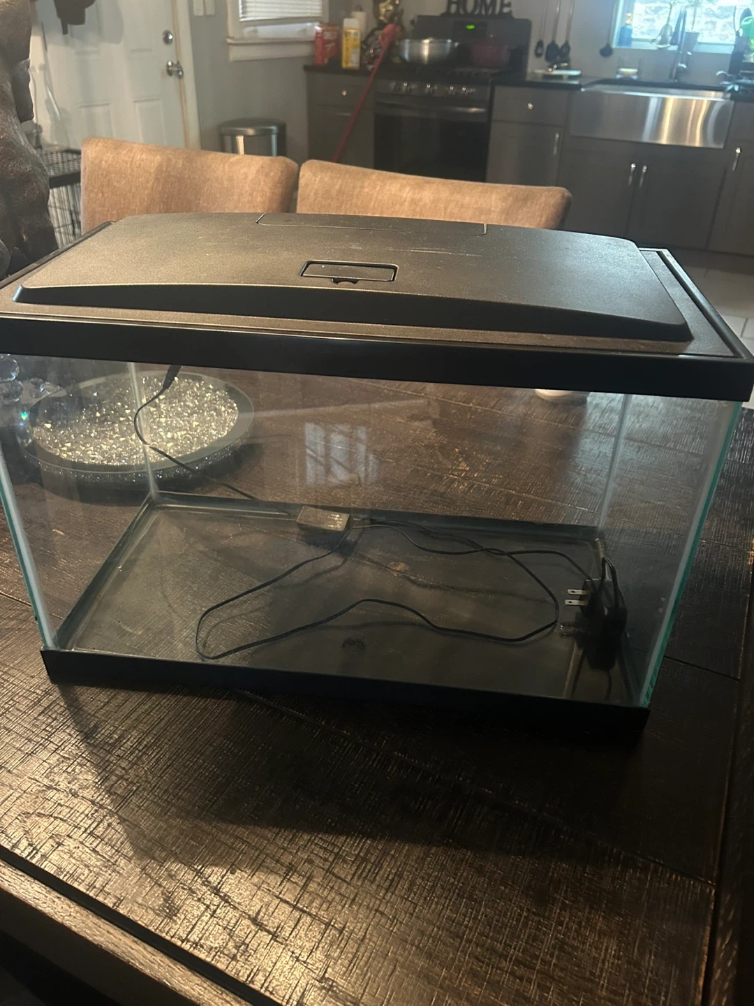 This is a glass aquarium fish tank with a black lid and built-in light. It's ready for your aquatic pets! Includes the tank, lid, and light. 10 gallon