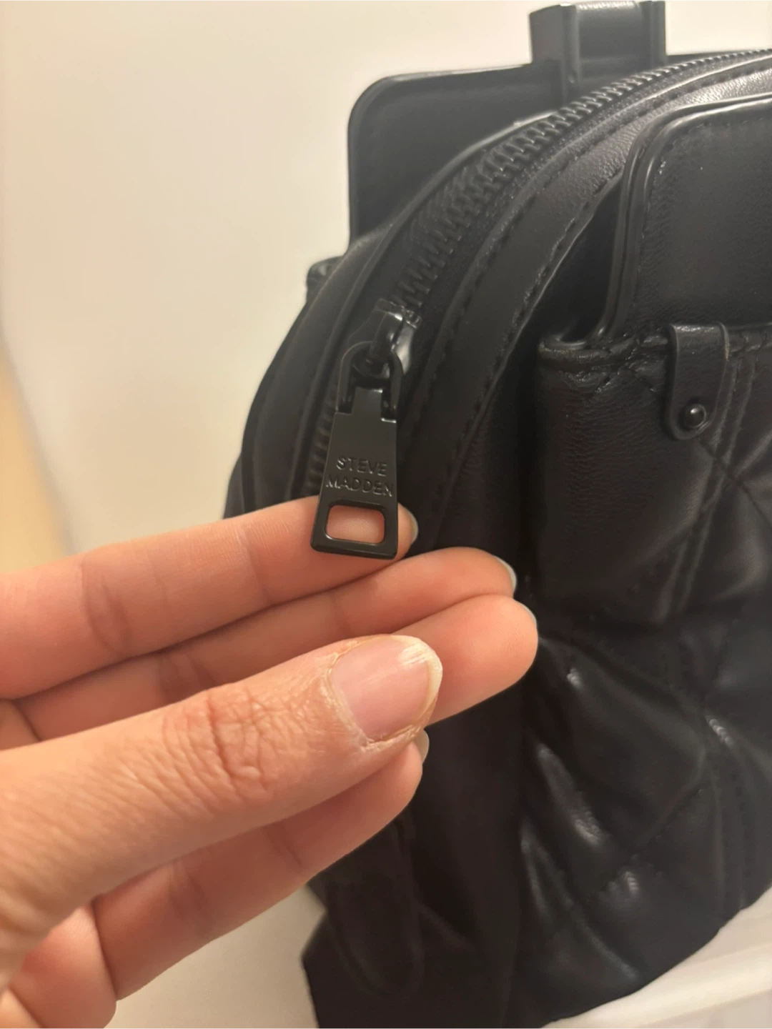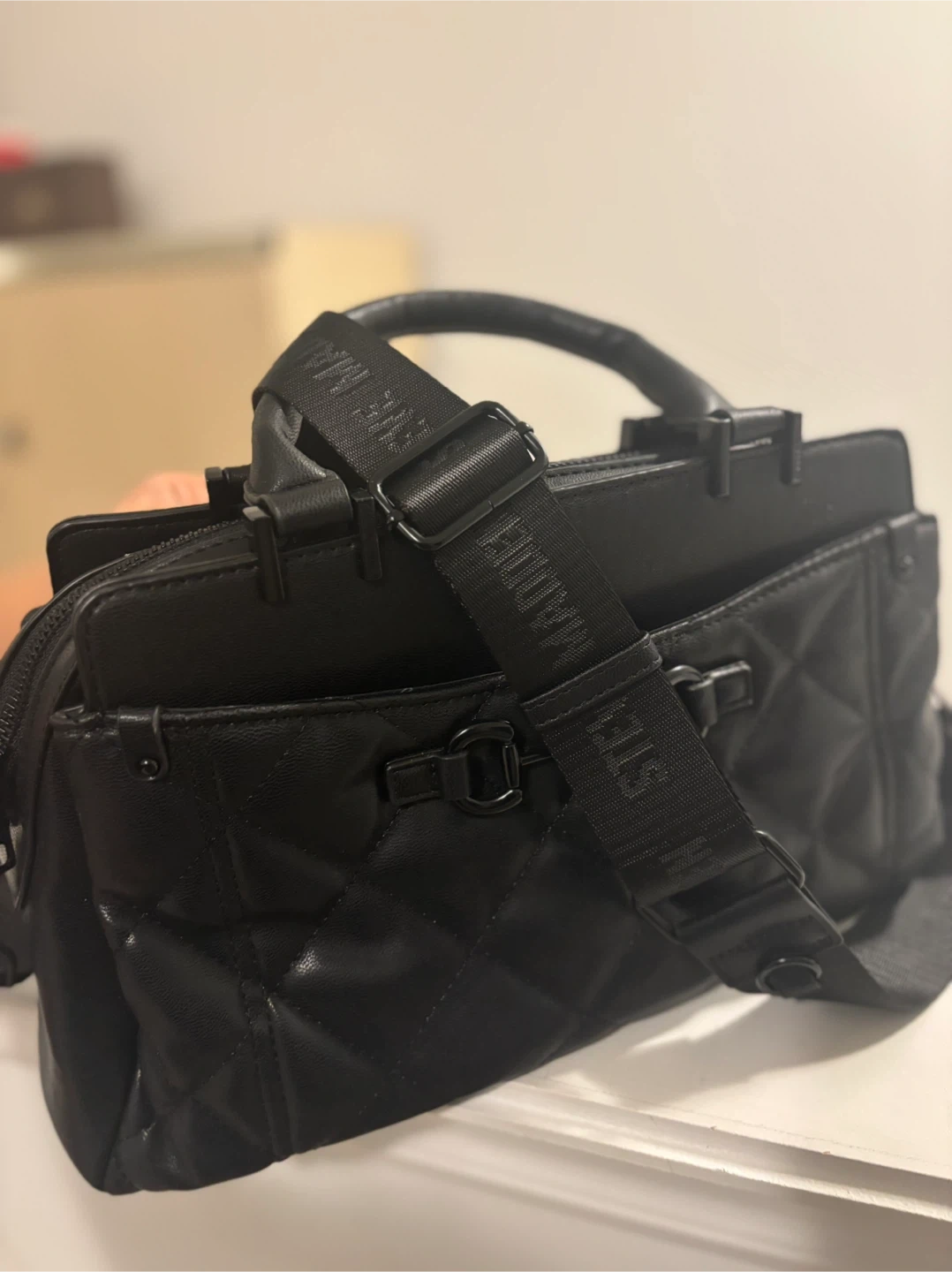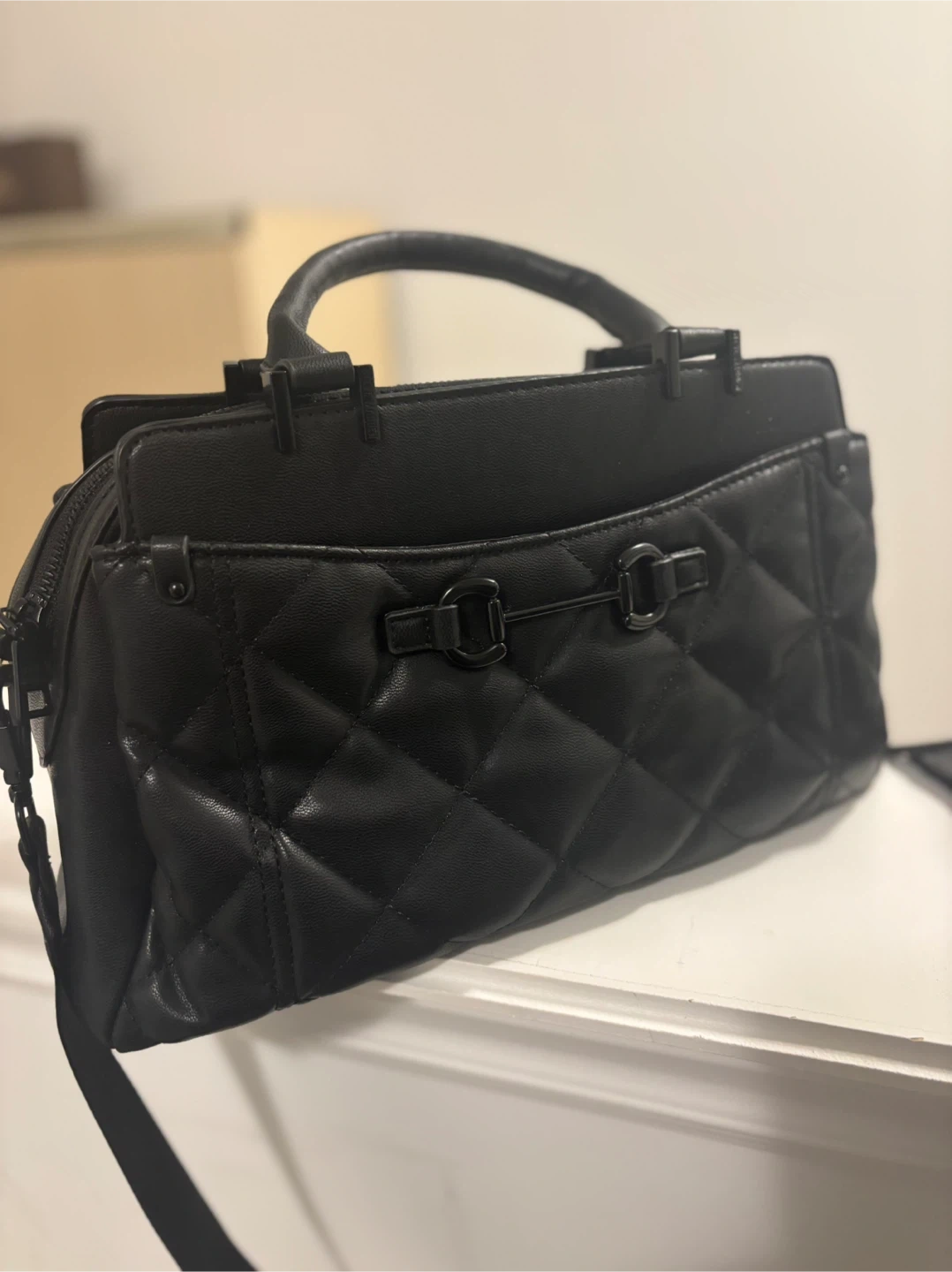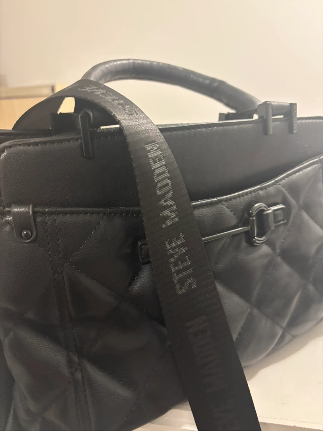 This is a Steve Madden black quilted satchel bag. It's made of faux leather with a zip closure. It comes with a detachable shoulder strap for versatile carrying.