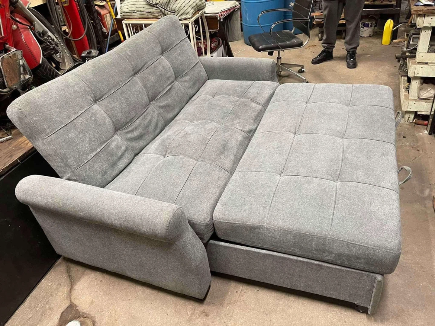This gray futon sofa bed offers versatile seating and sleeping options. It features tufted upholstery and a pull-out chaise for extra lounging space. Its simple design makes it a functional addition to any room.