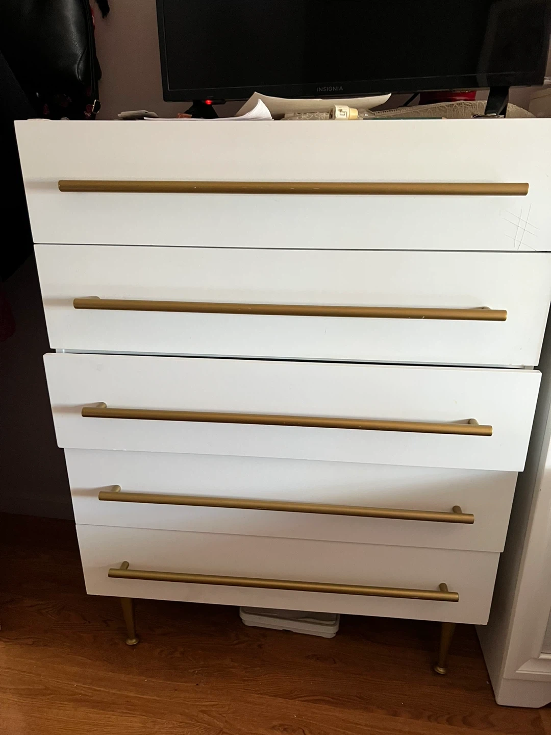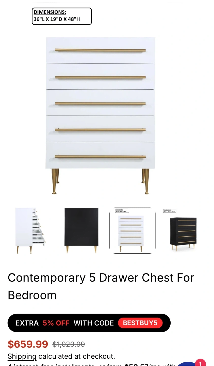 Buy & SellContemporary 5 Drawer Chest For BedroomContemporary 5 Drawer Chest For Bedroom$150This is a contemporary 5-drawer chest for the bedroom. It features gold handles and legs. Dimensions are 36" L X 19" D X 48" H. White finish.ConditionLike newWHERE TO MEETCheck LocationView MapSELLERverifiedPenelopeEast Elmhurst650 reviews0 chats·0 favorites·52 viewsSEND CHAT TO SELLERHi Penelope! I’m interested in your listing.Hi Penelope! I’m interested in your listing.Get the Karrot app to chatSign In to chat