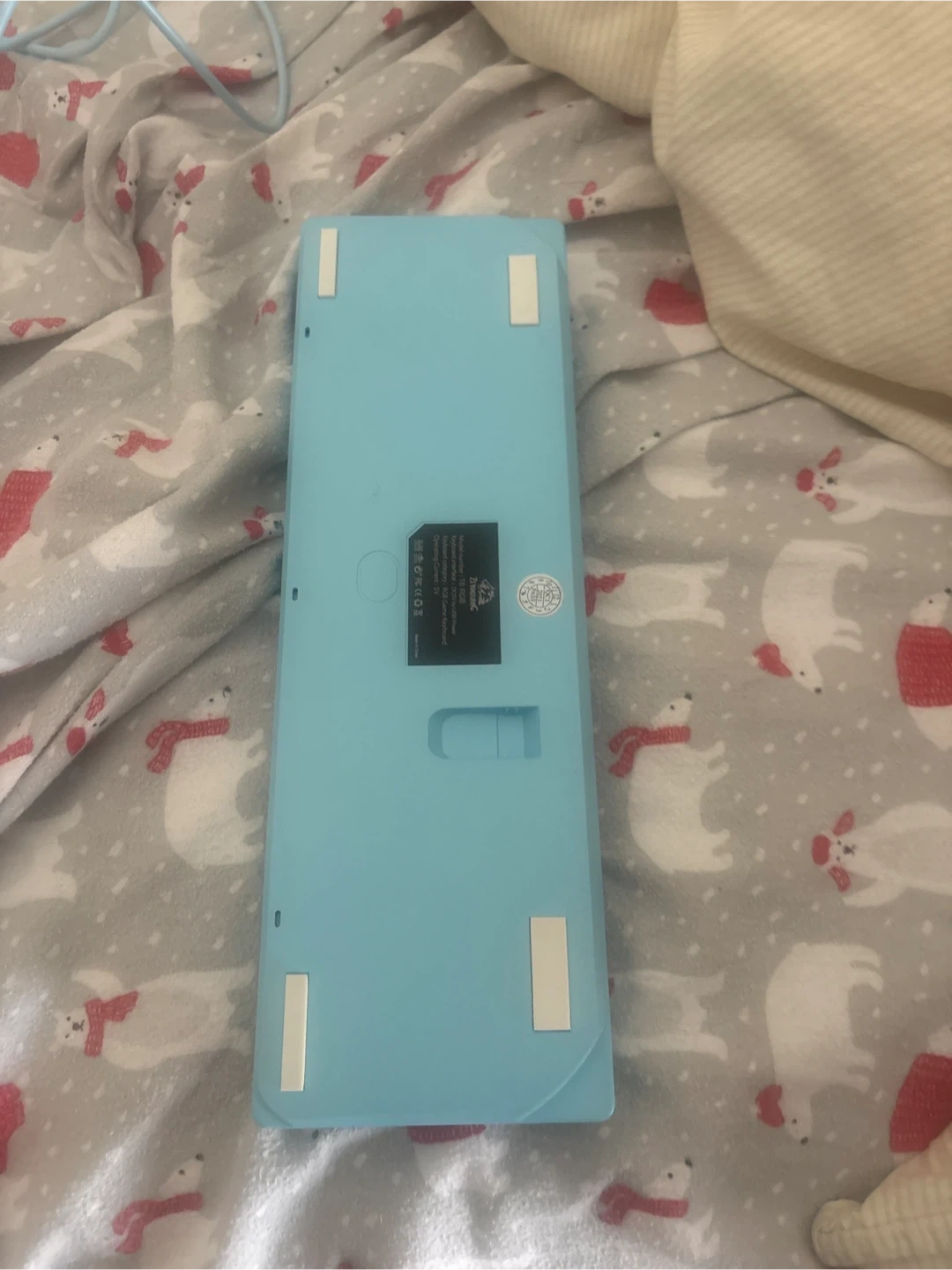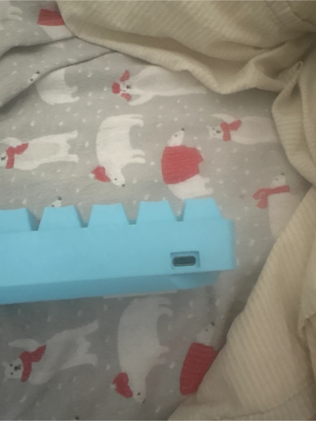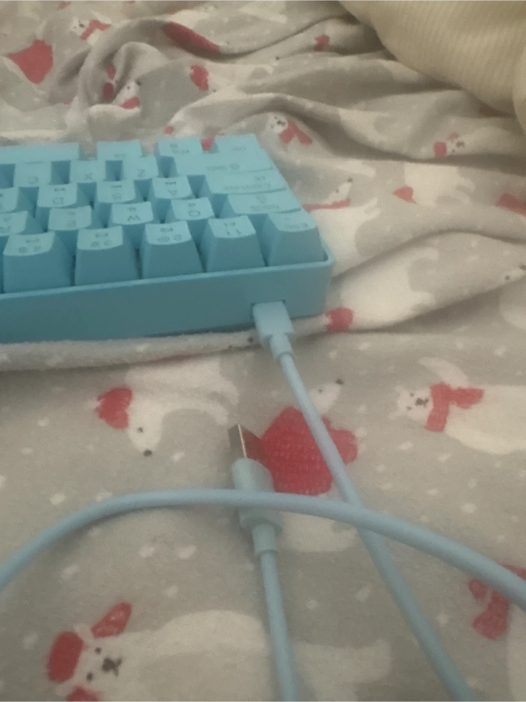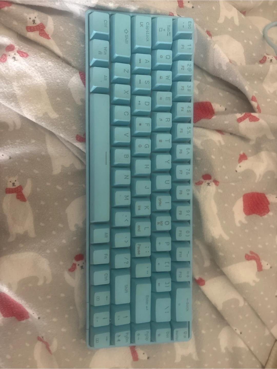 This is a compact mechanical keyboard in a light blue colour. It features a USB-C connection. It's a great choice for saving desk space!