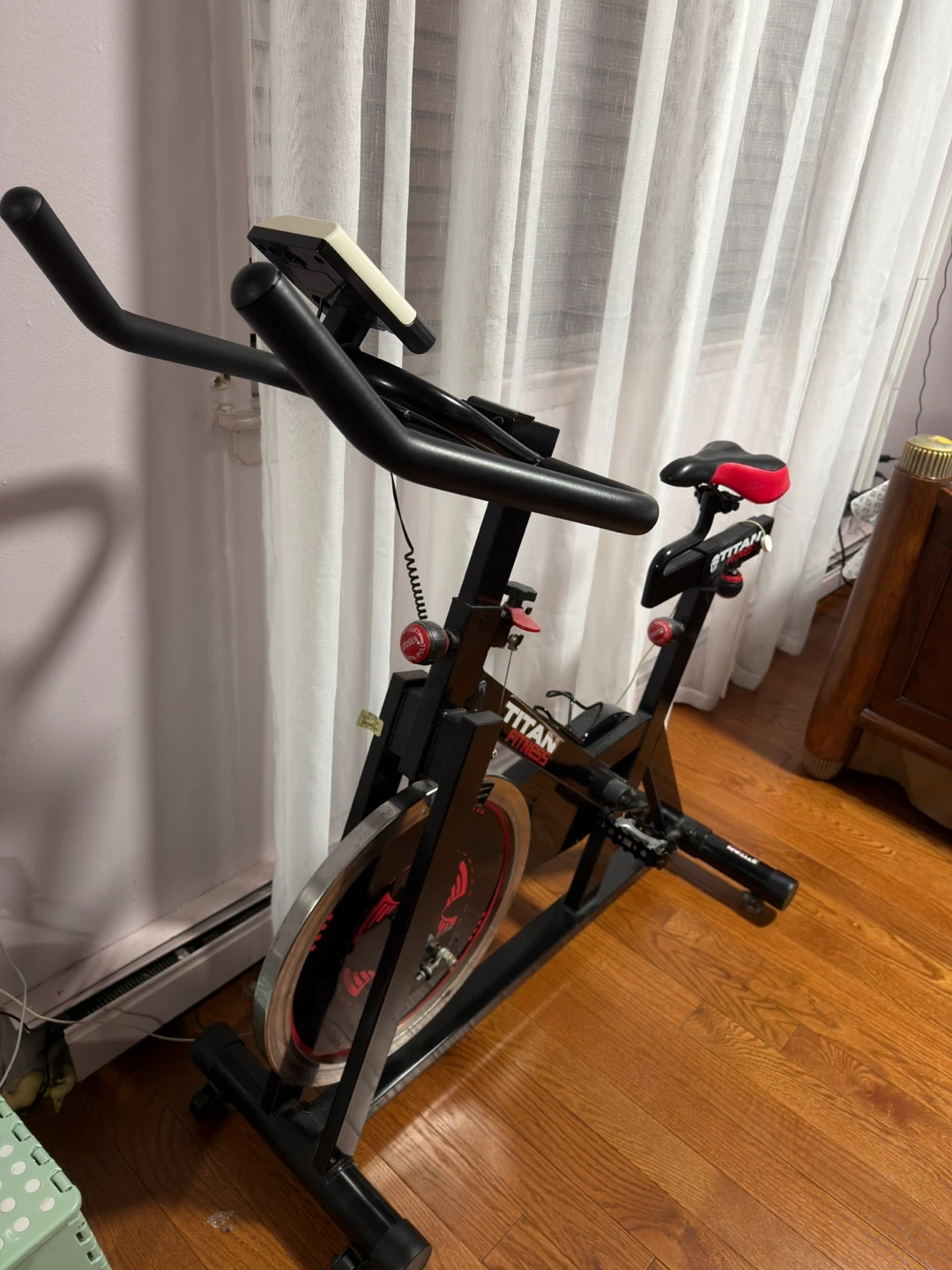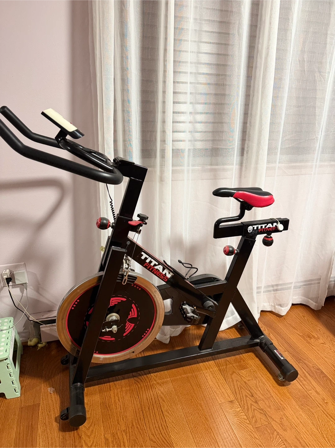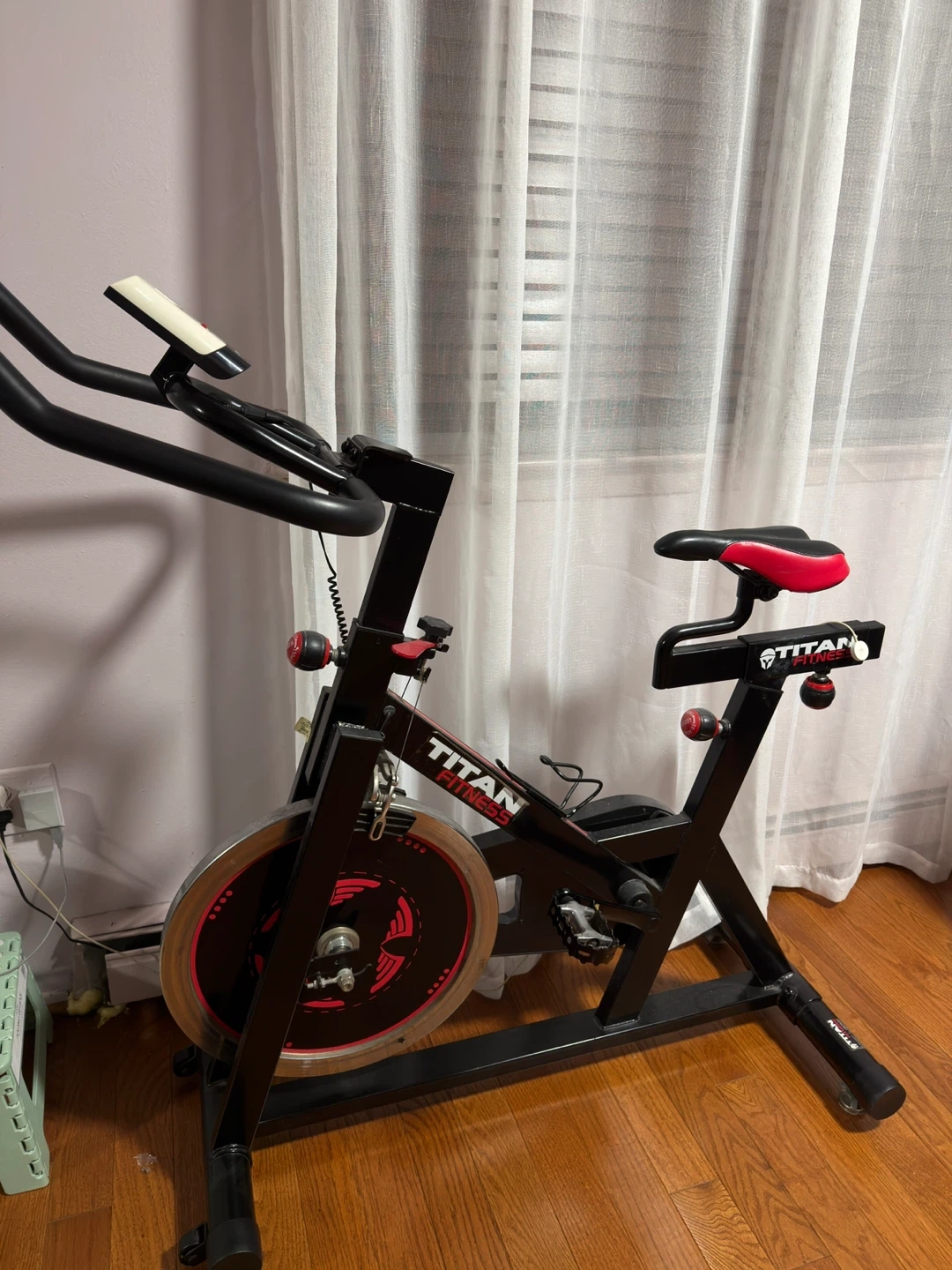 Titan Fitness spin bike with adjustable seat and handlebars. Solid construction for an intense workout. It's a great addition to any home gym!