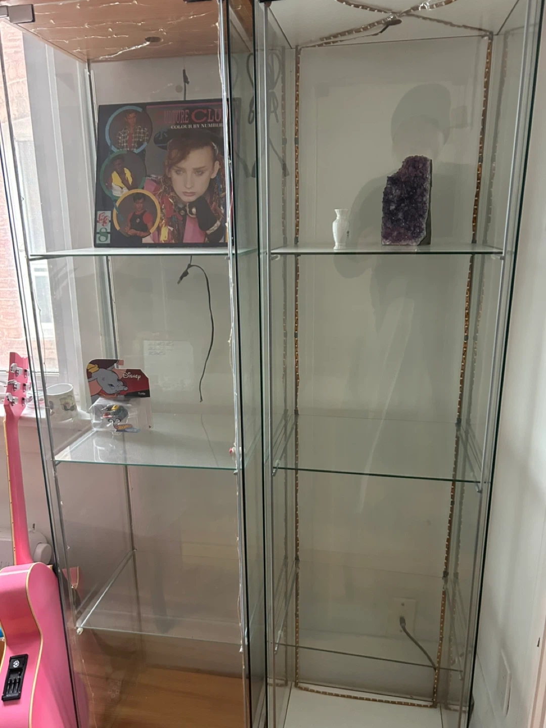 Two tall glass display cabinets with adjustable glass shelves. Each cabinet features built-in LED strip lighting along the vertical edges for illumination. They're perfect for showcasing collectibles, decor, or retail items.