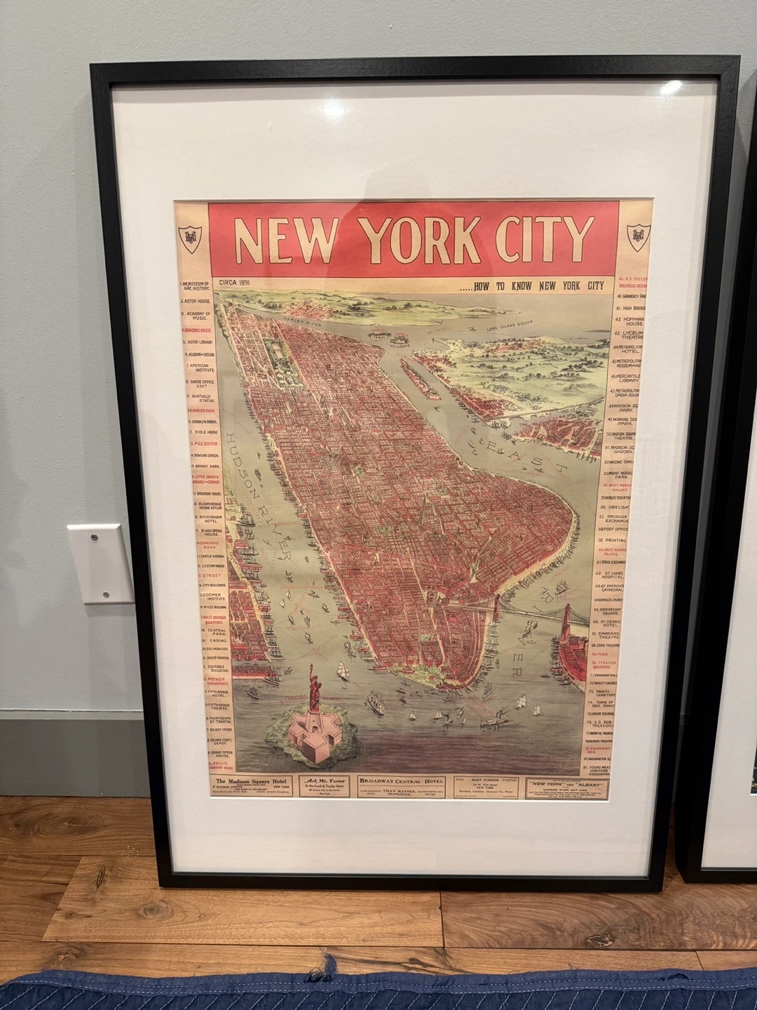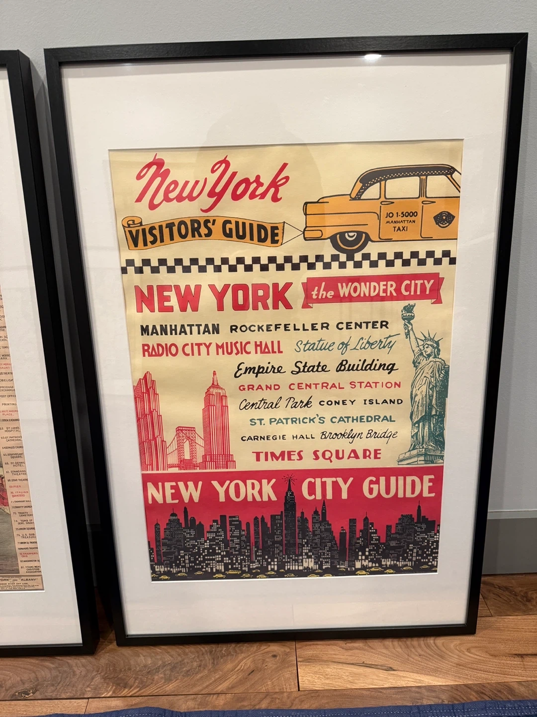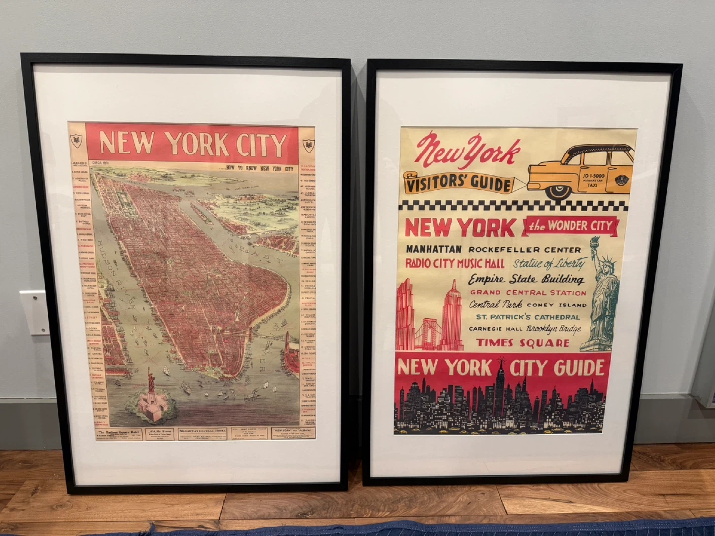Selling two framed art prints of New York City guides. One is a visitor's guide featuring landmarks and a yellow taxi, while the other is a map of the city. They're in great condition and ready to add a touch of NYC to your home! 25x37