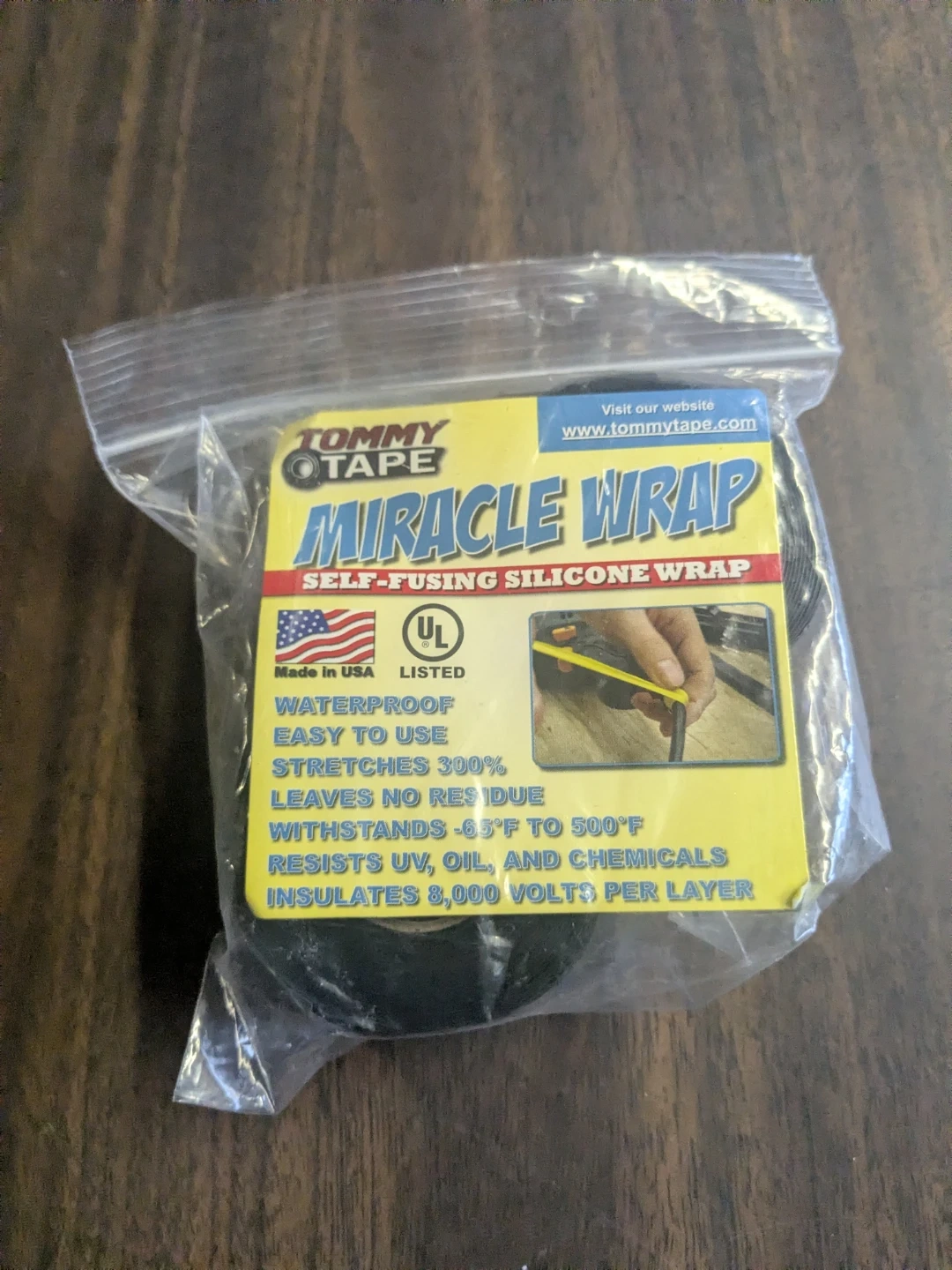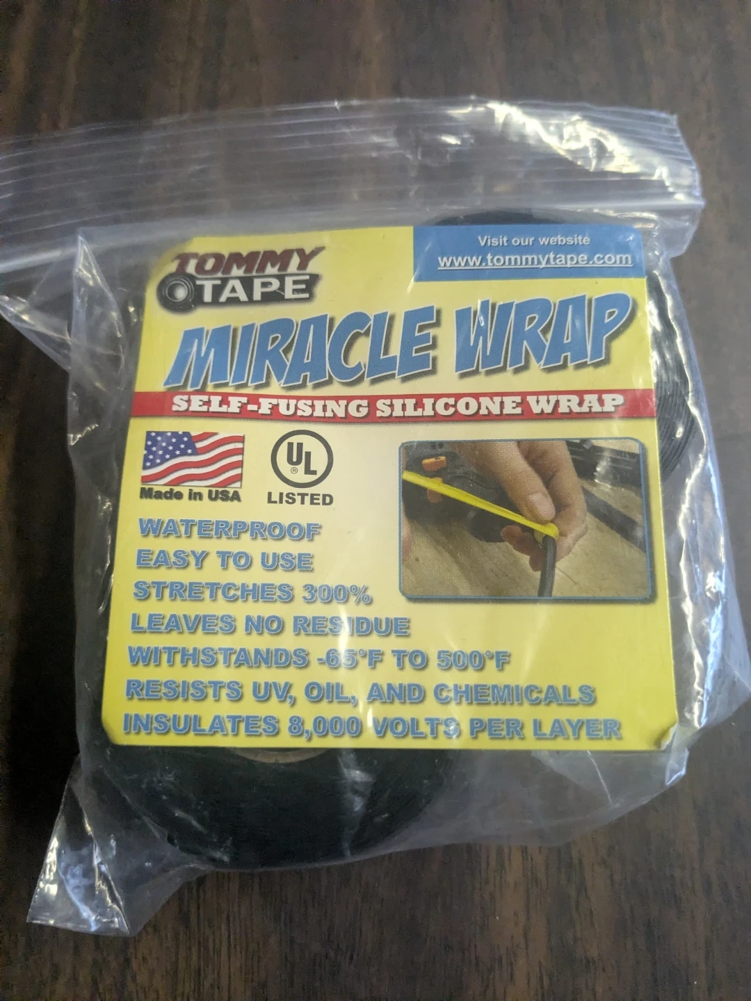 Tommy Tape Miracle Wrap is waterproof and easy to use! It stretches 300%, leaves no residue, and withstands -65°F to 500°F. It also resists UV, oil, and chemicals, and insulates 8,000 volts per layer