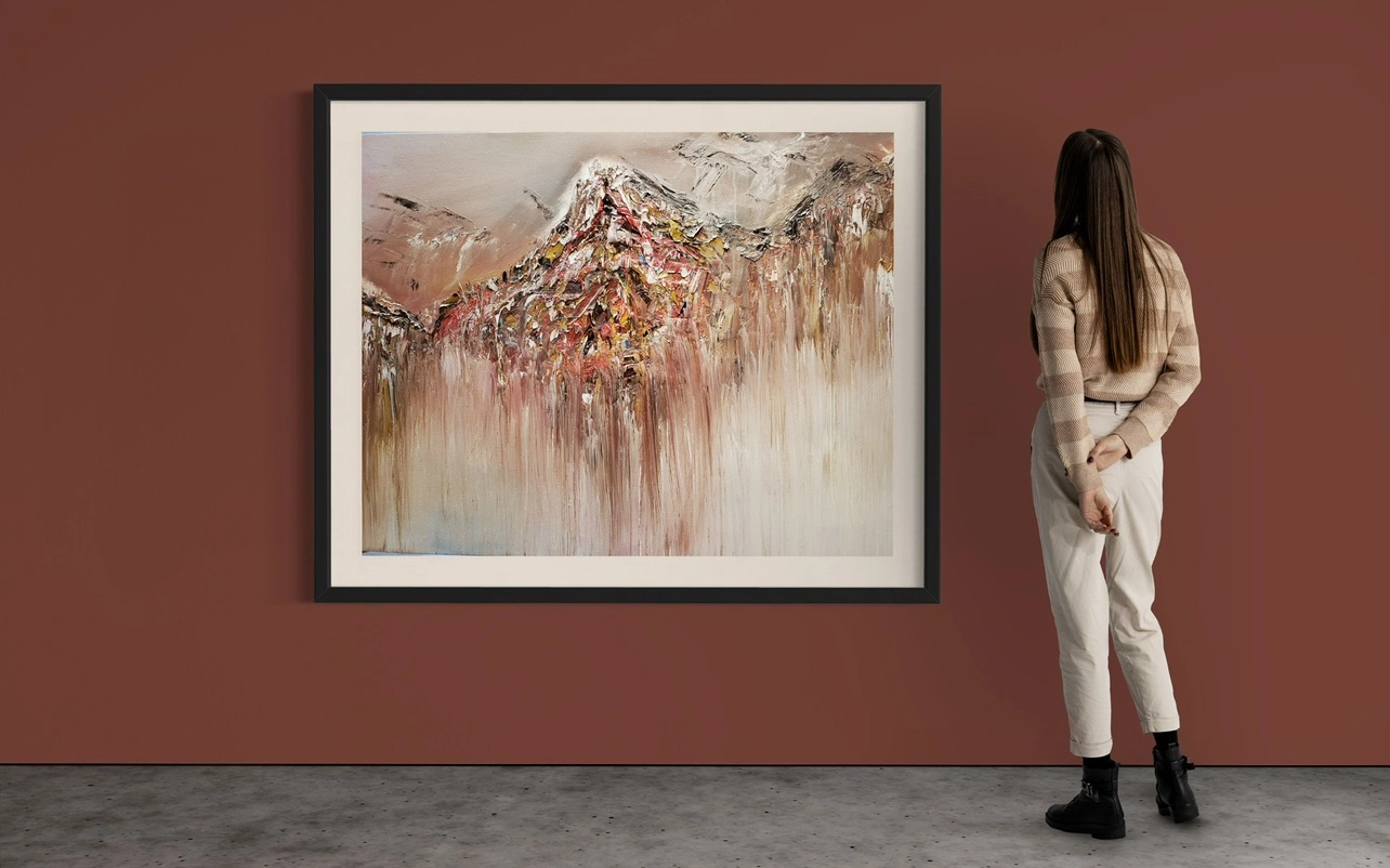 An abstract oil painting with colours of brown, red, grey, and white. The painting features brush strokes and textures that create a visual interest.