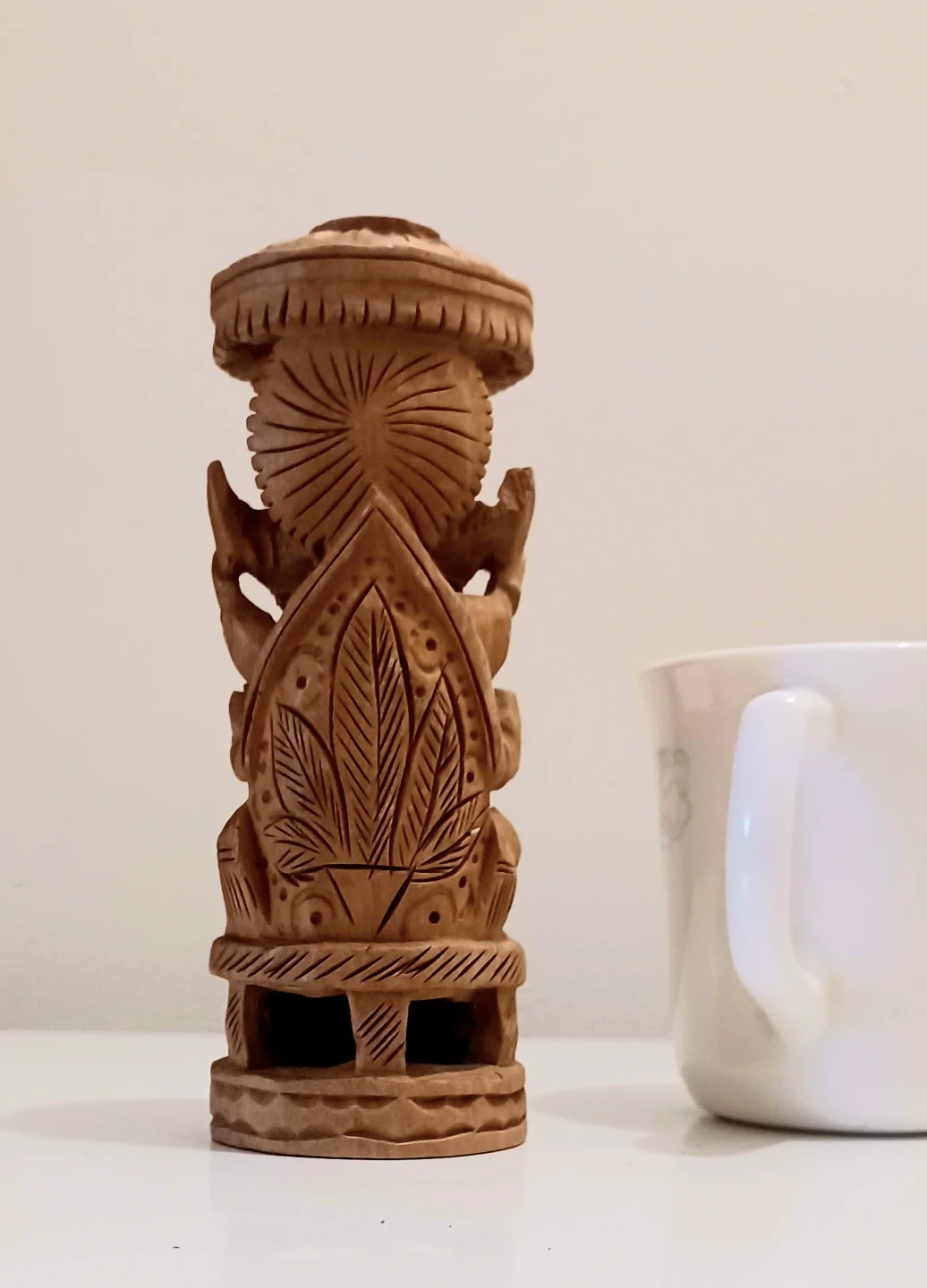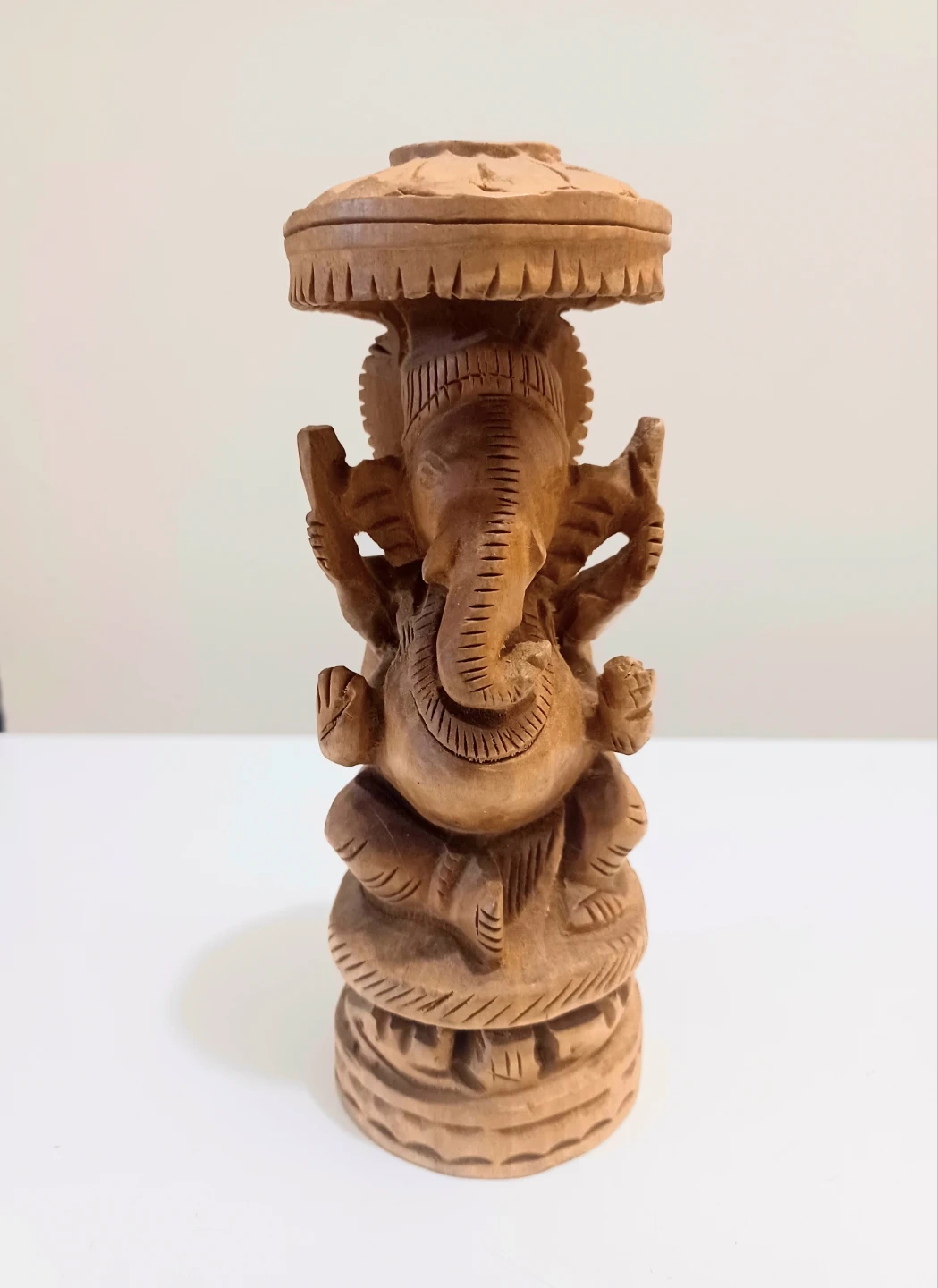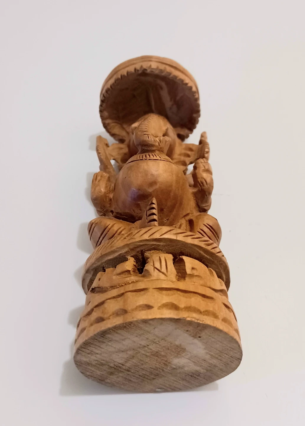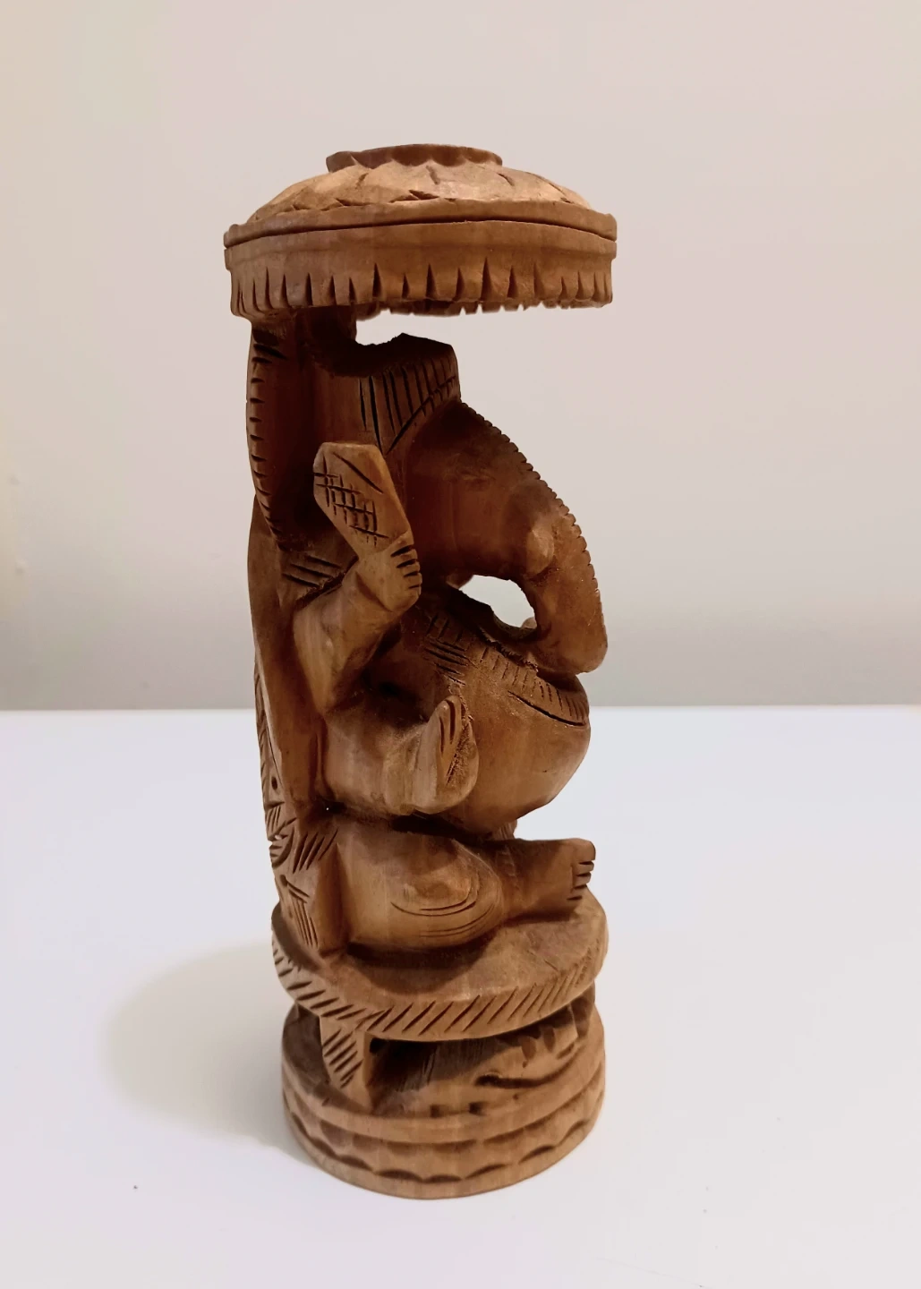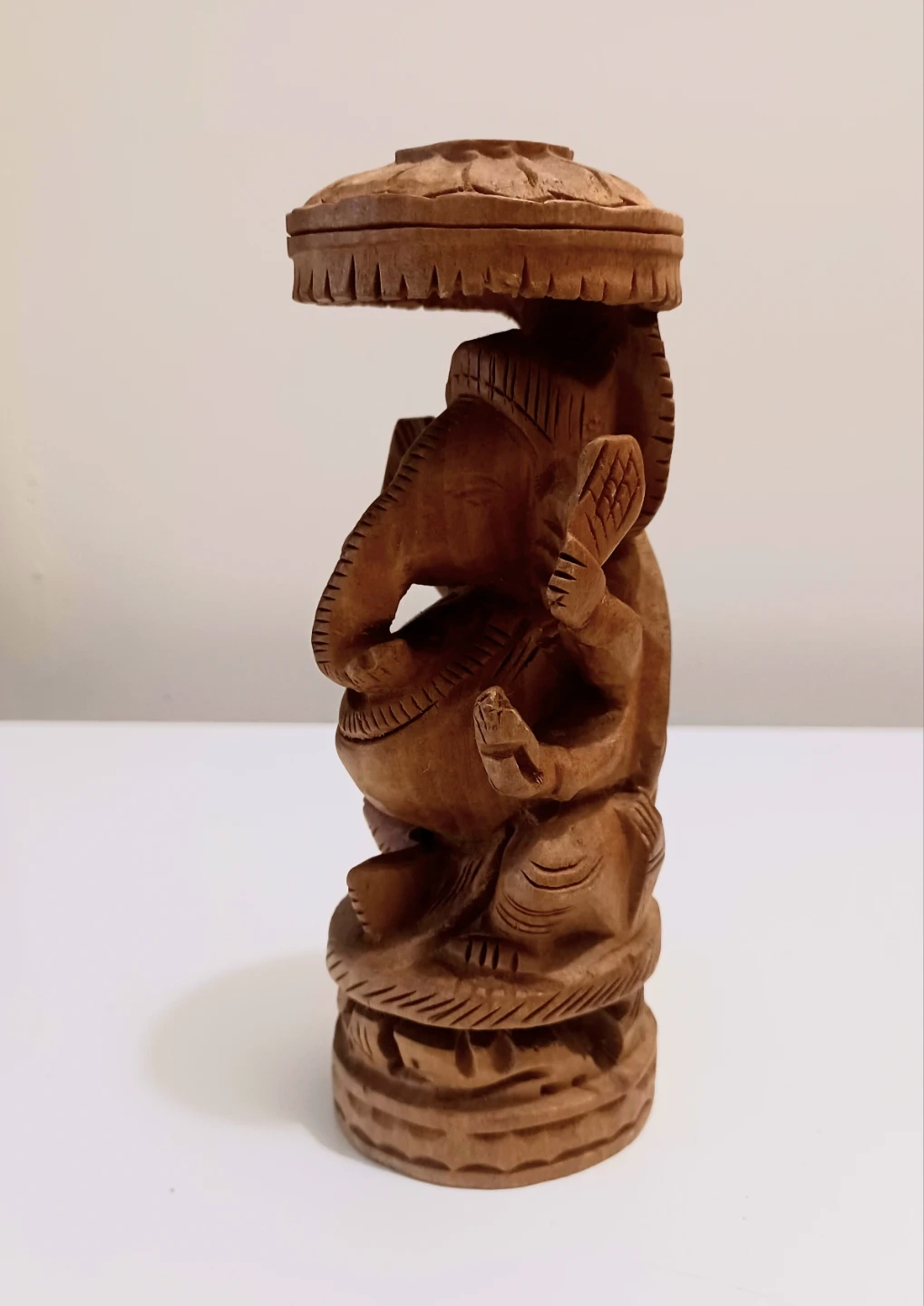 Enhance your space with this unique wooden Ganesh statue! This used statue depicts the Hindu god Ganesh, beautifully carved from wood. It's a distinctive piece that adds an exotic touch to any decor. It is in very good condition