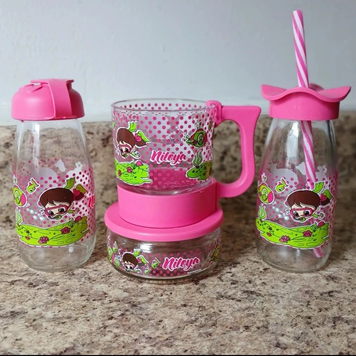 This set includes a glass mug, a water bottle with a straw, and a small jar. All pieces feature a fun diver graphic and pink polka dots. They're perfect for kids' drinks! Come in a box.