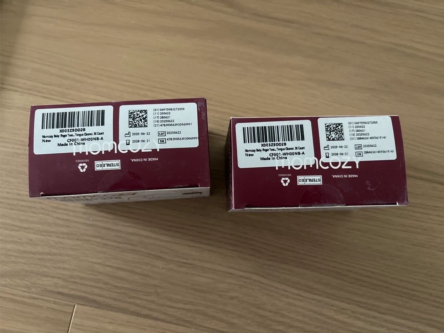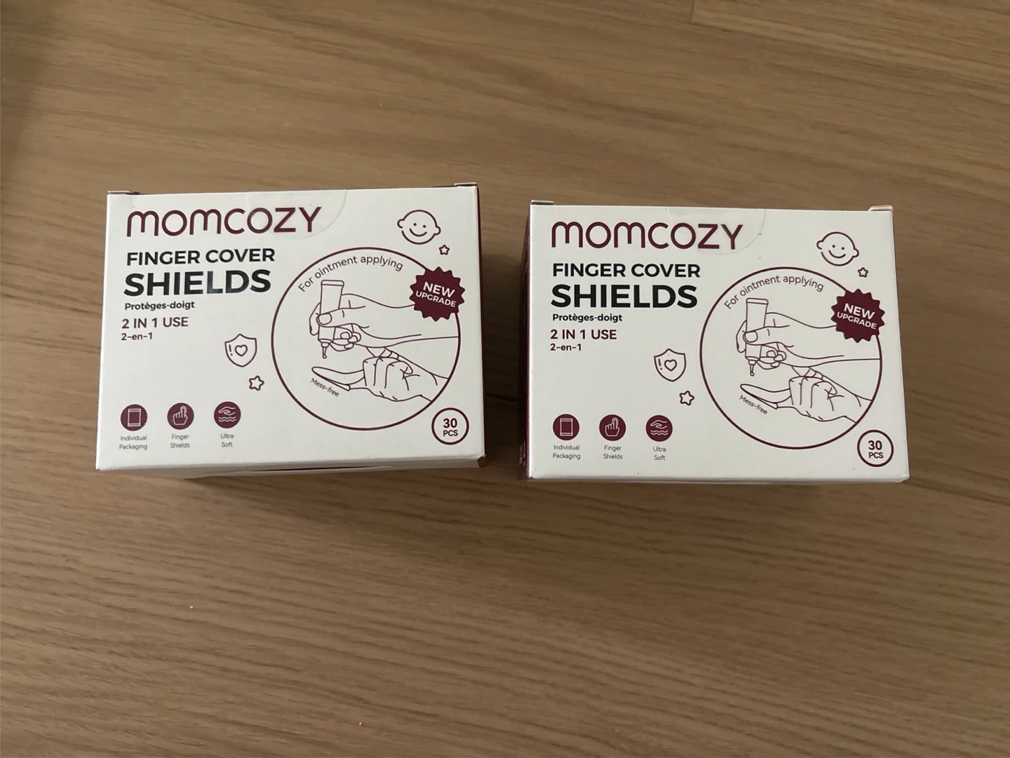 Momcozy Finger Cover Shields for ointment application. Each box contains 30 pieces, for a total of 60 shields. They're 2 in 1 use and ultra soft. Made in China.