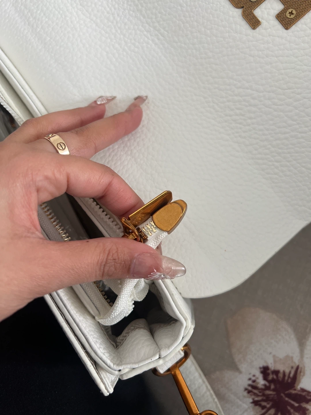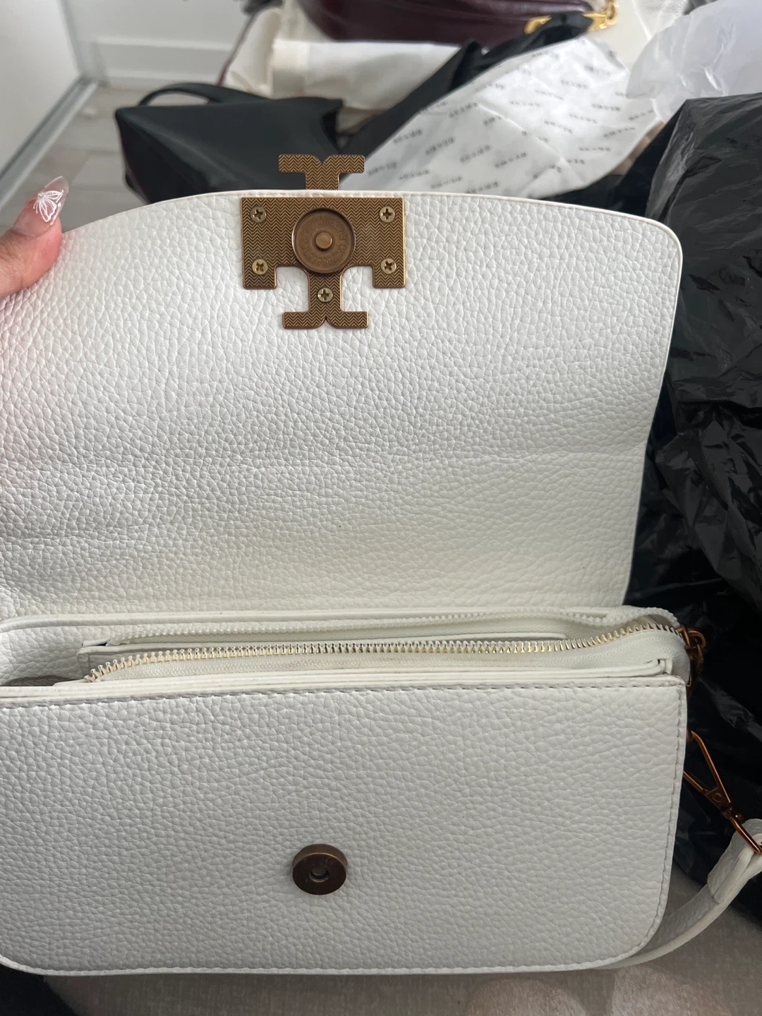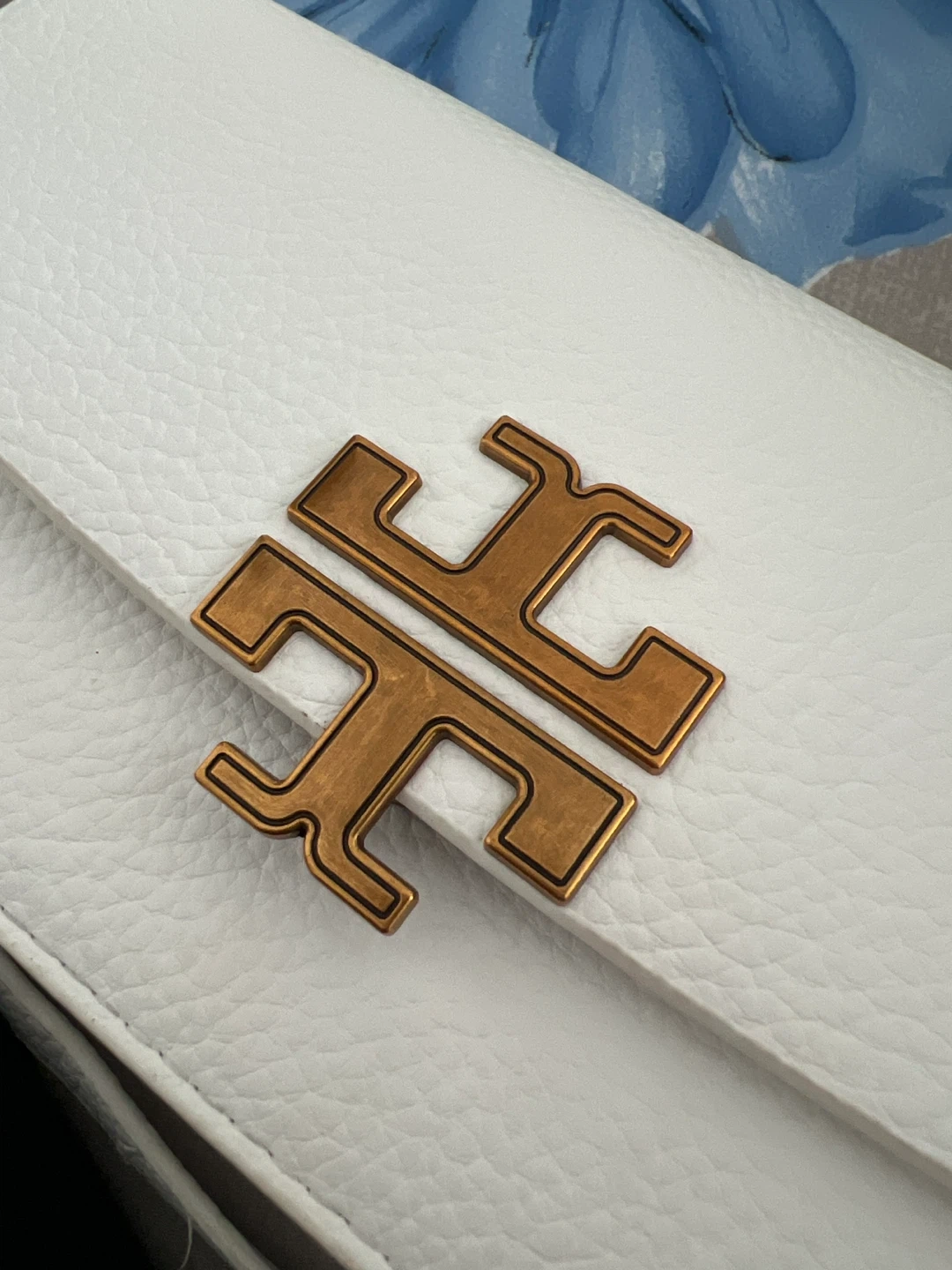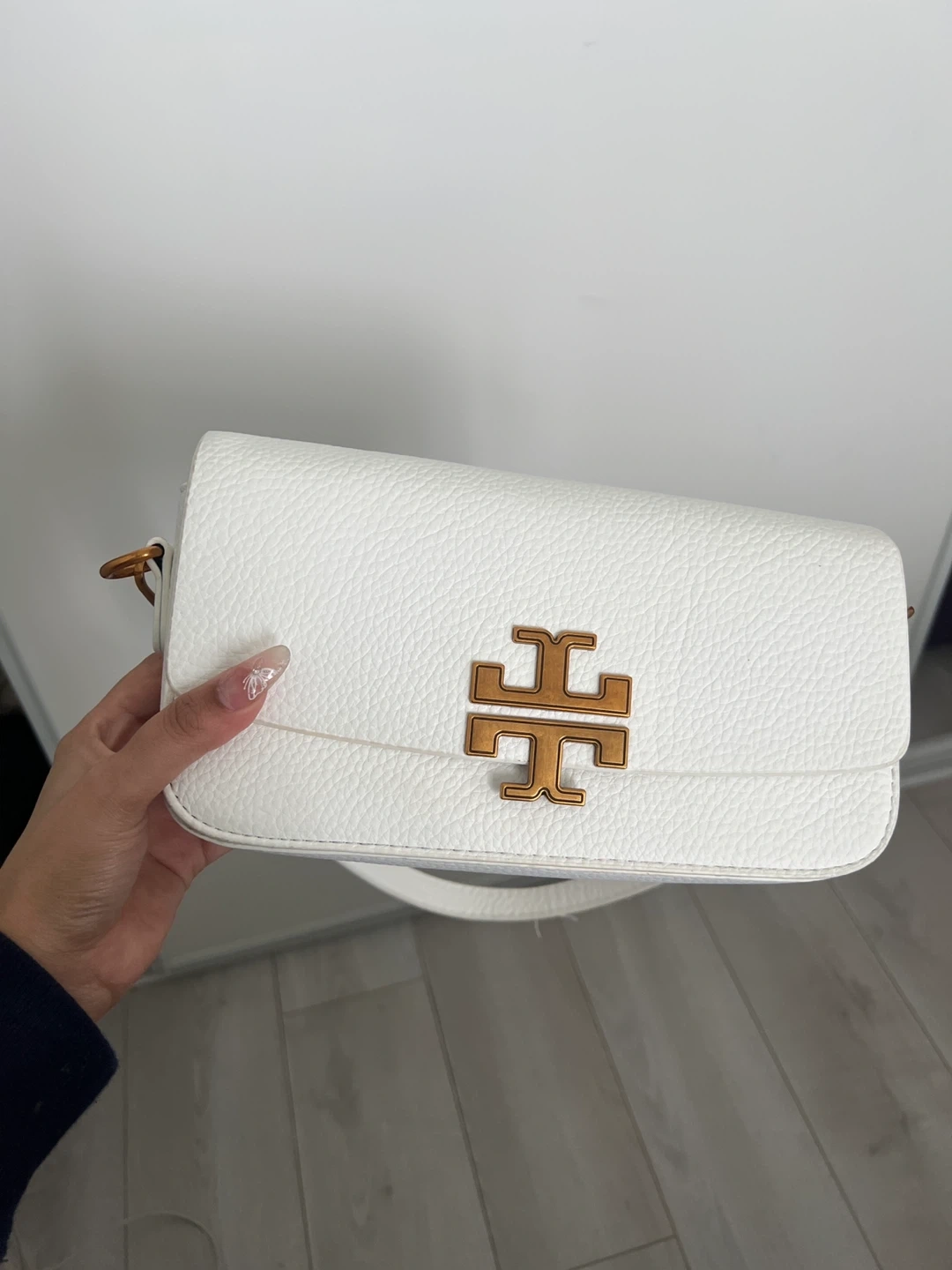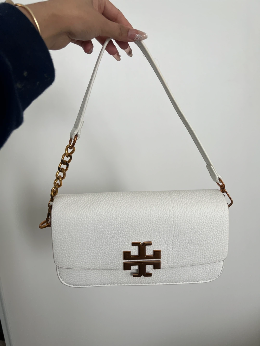 This is a white pebbled leather Tory Burch shoulder bag. It has a rust gold-toned logo clasp closure and a removable chain strap with leather shoulder rest. It also includes an interior zipper pocket and a snap closure.