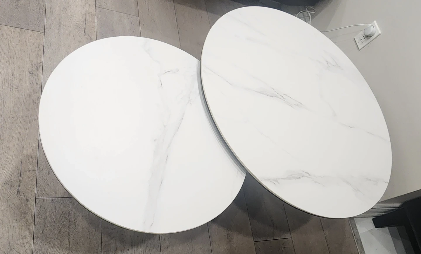 Beautiful modern coffee table with rotating dual-circle design. Stylish and functional statement piece for any living room.