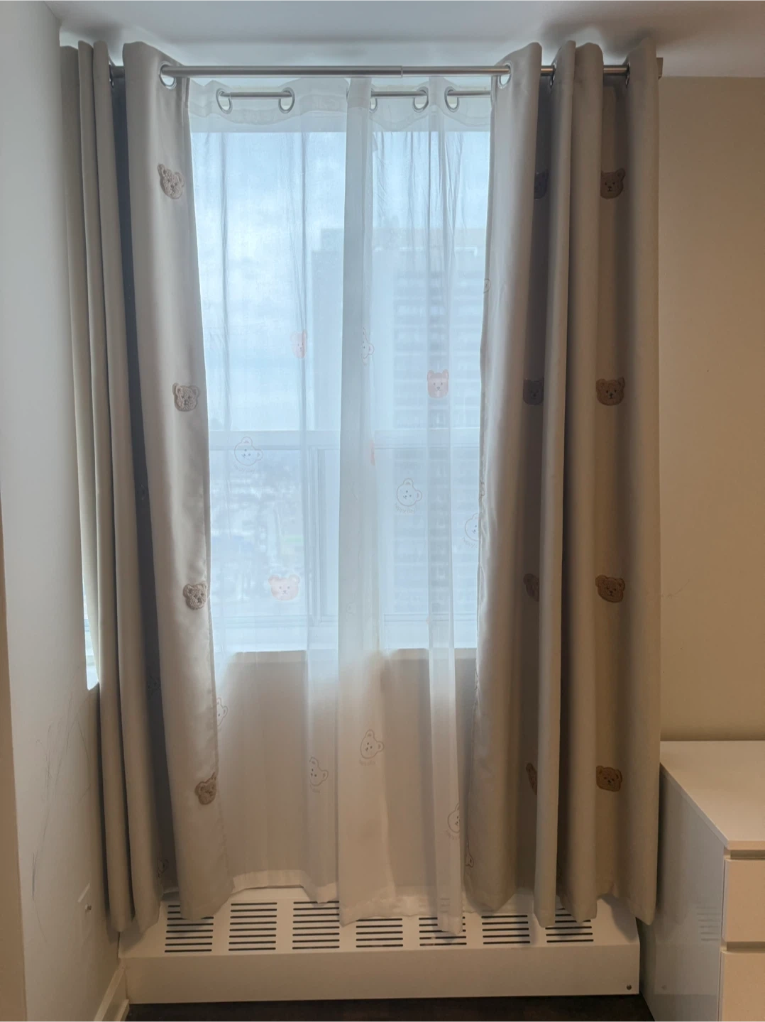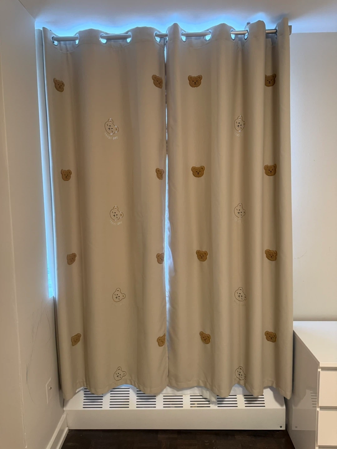 These light beige curtains feature a charming all-over print of teddy bears. They're made of a durable fabric and come with grommets for easy hanging. Perfect for a nursery or child's room!