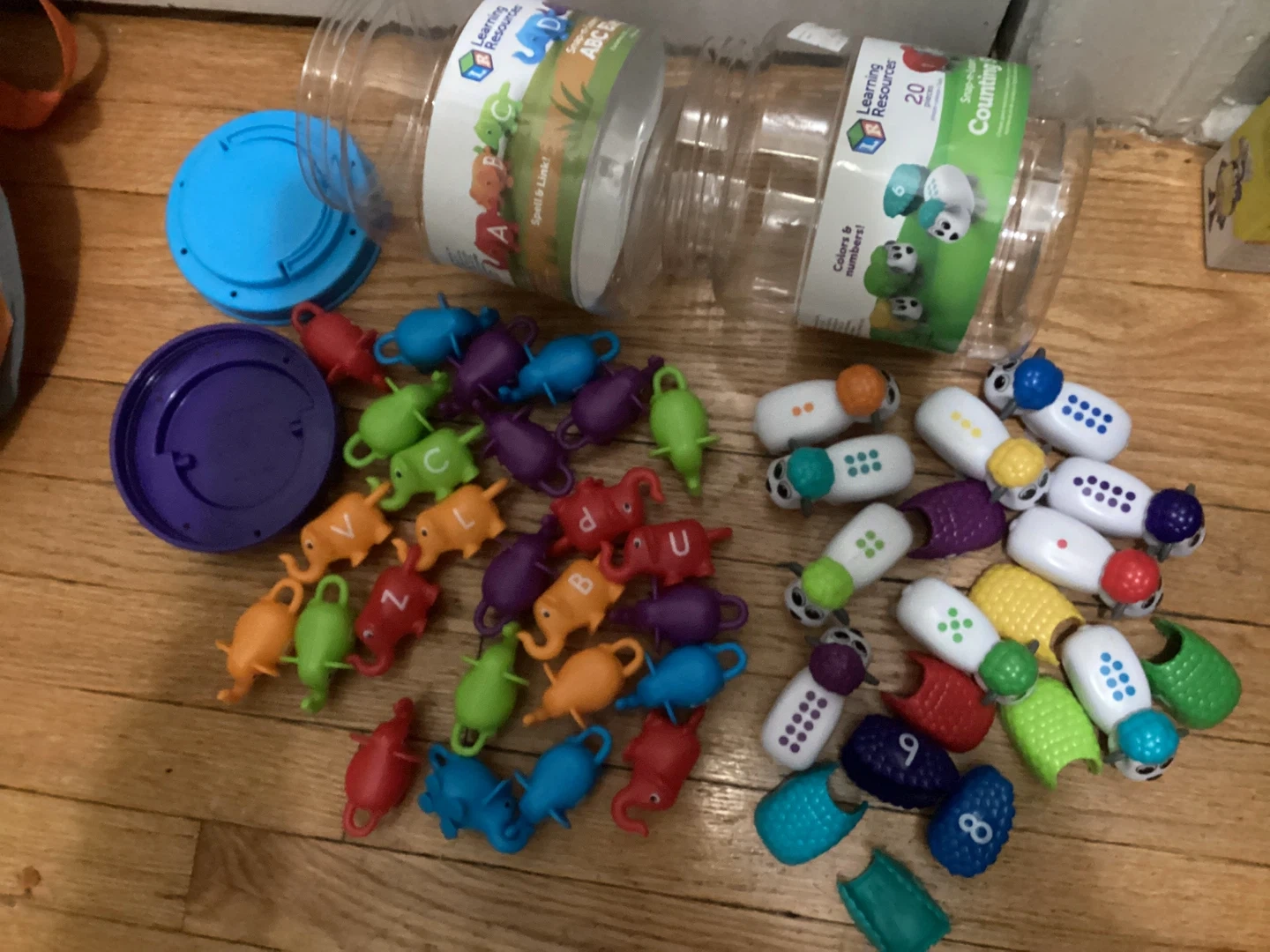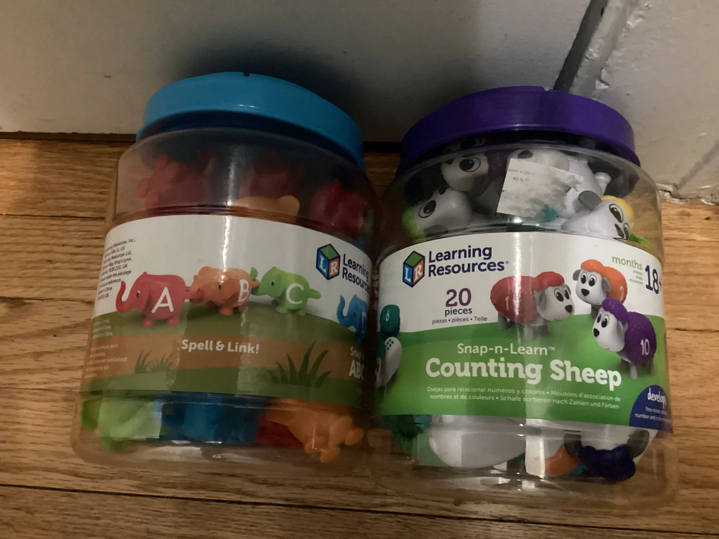 Price for both. I have two Learning Resources Snap-n-Learn sets for sale! One is the Counting Sheep set, and the other is the Spell & Link set. Both are designed for kids 18+ months to help with counting, colors, numbers and spelling. Elephants is complete, sheep missing one small top piece.