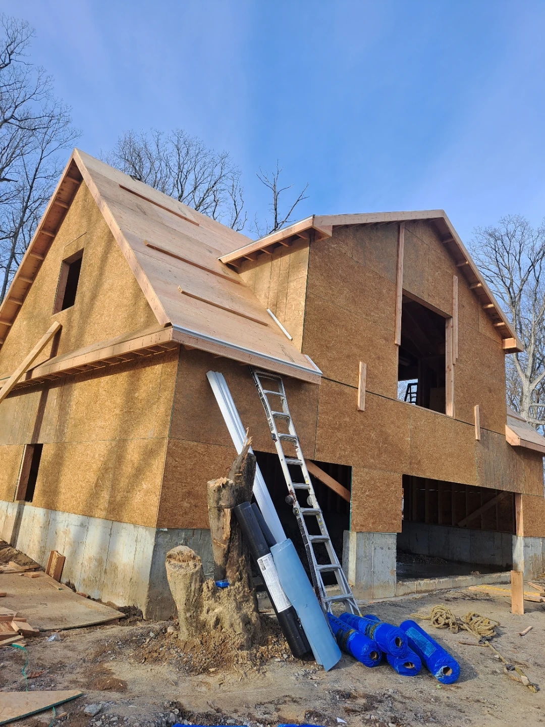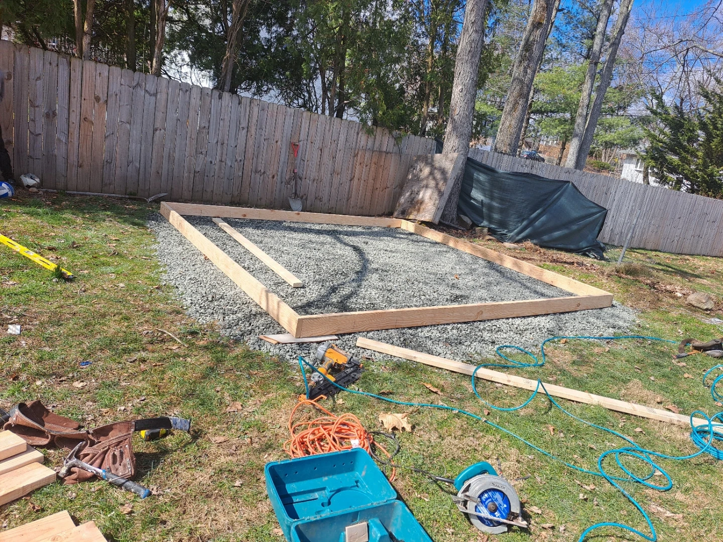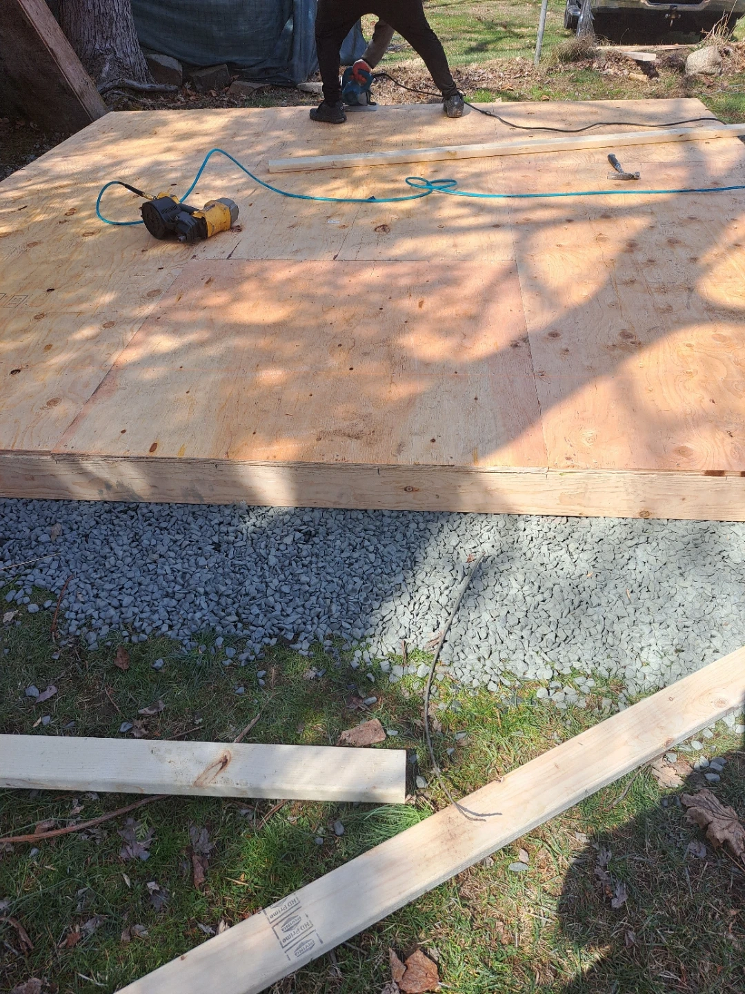 Framing lumber and plywood sheets for a shed project. Includes wall studs, joists, and sheathing. Ideal for DIY construction or building a backyard structure. Ready for assembly!