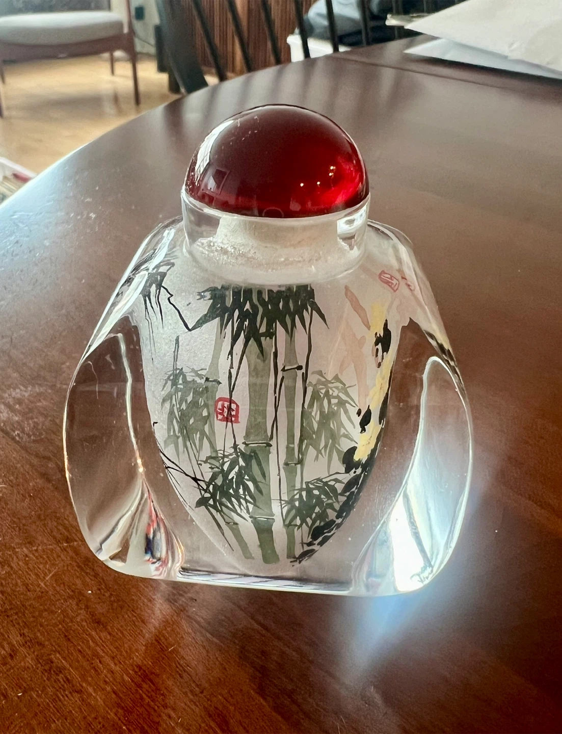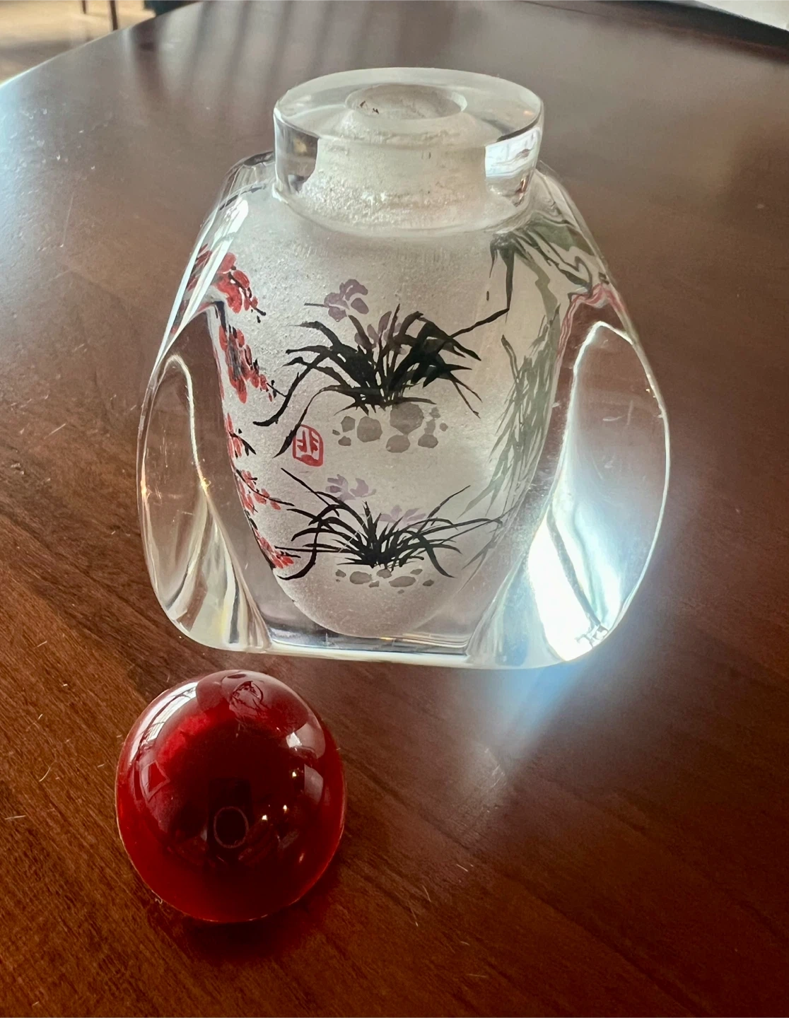 This decorative glass bottle features intricate hand-painted designs of flora and bamboo. It has a frosted glass interior and a shiny red orb stopper. Its unique shape makes it a lovely accent piece.
