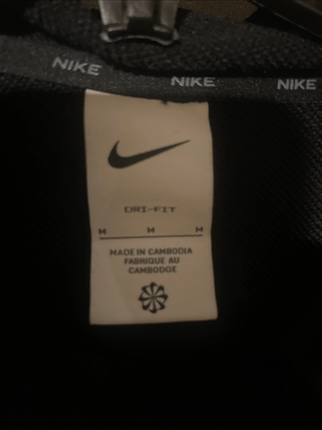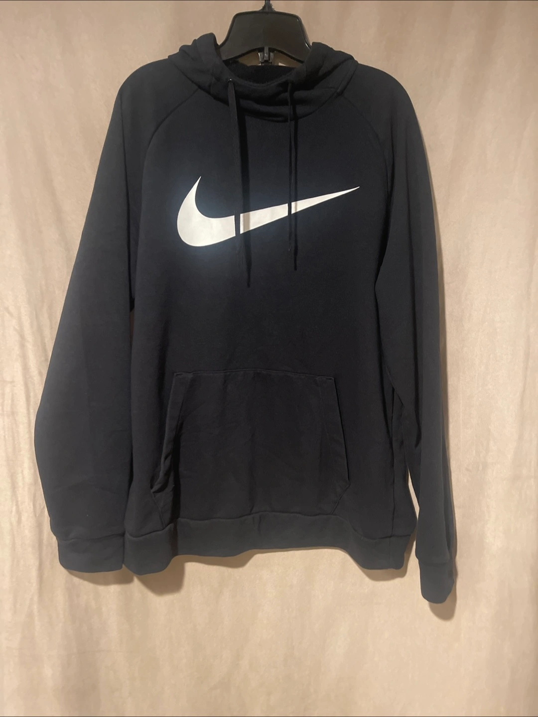 Selling a Nike Dri-FIT hoodie in black, size medium. It's in good condition and perfect for workouts or casual wear! The iconic Nike swoosh is prominently displayed on the front.