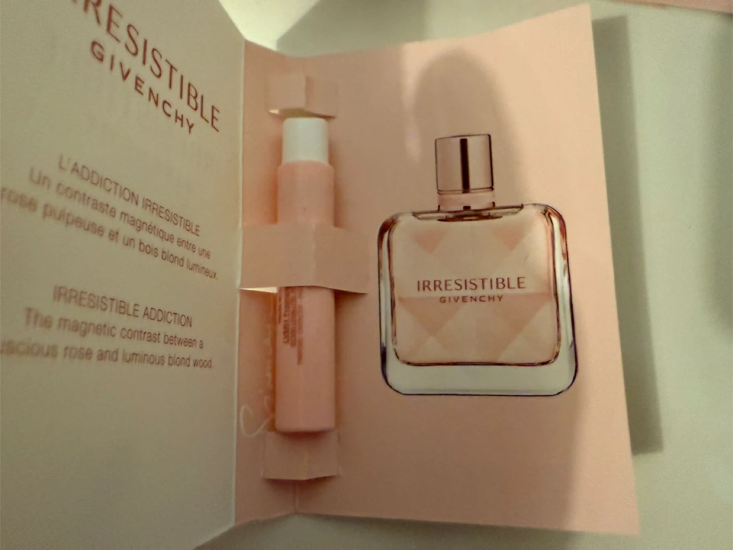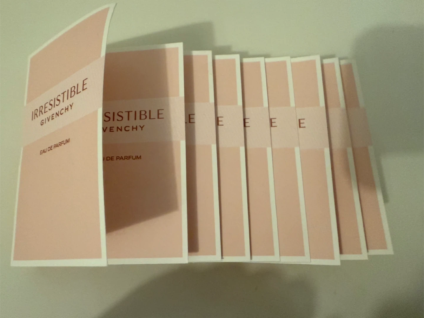This is a lot of 9sample sachets and 1 mini spray of Givenchy Irresistible Eau de Parfum. The larger sachet shows a picture of the full-sized perfume bottle. Perfect for trying out the fragrance before committing to a full bottle!