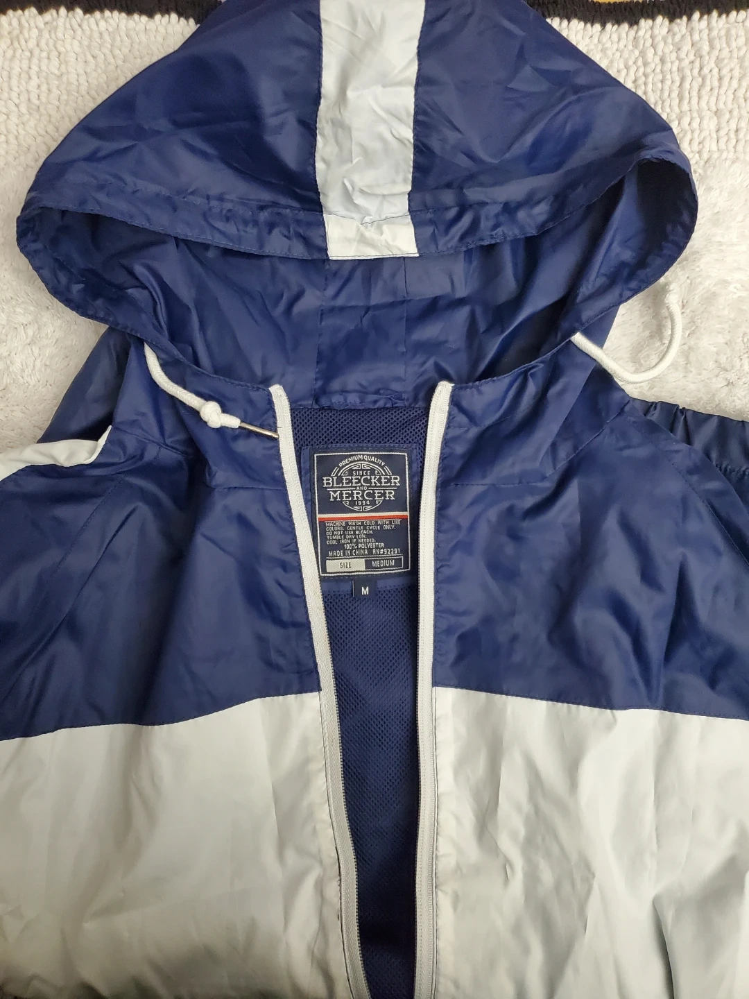 This is a Bleecker & Mercer windbreaker jacket. It's blue and white with a hood. Made of 100% polyester material. Machine wash cold, gentle cycle only.