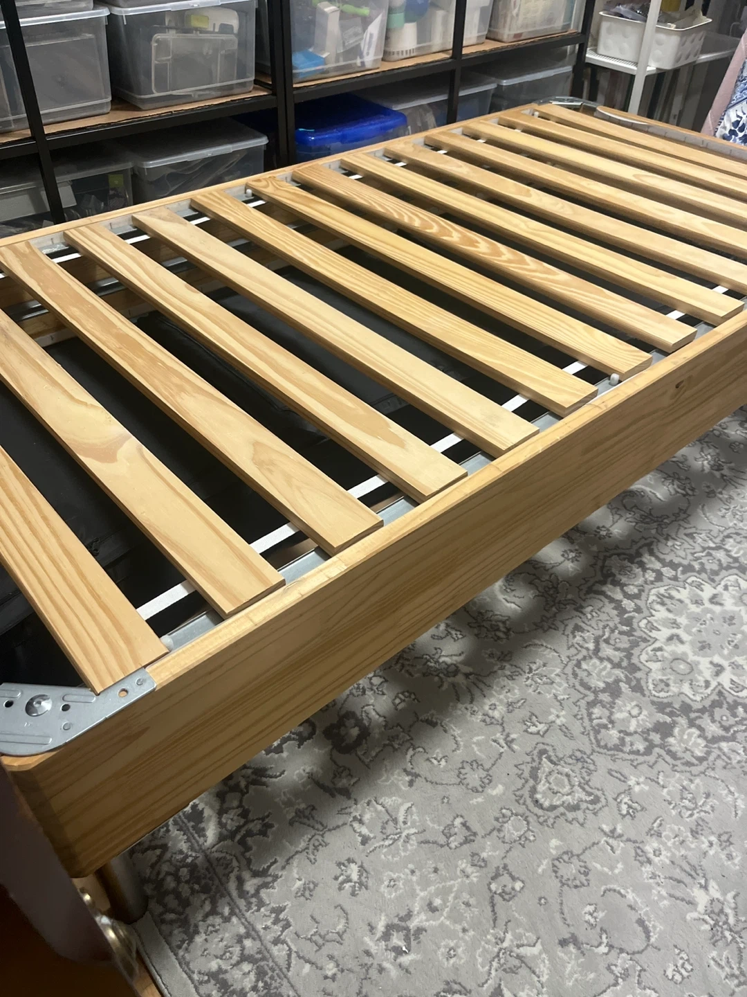 This is an Ikea bed frame with a slatted base. It's made of solid wood and metal components. The slats provide mattress support.