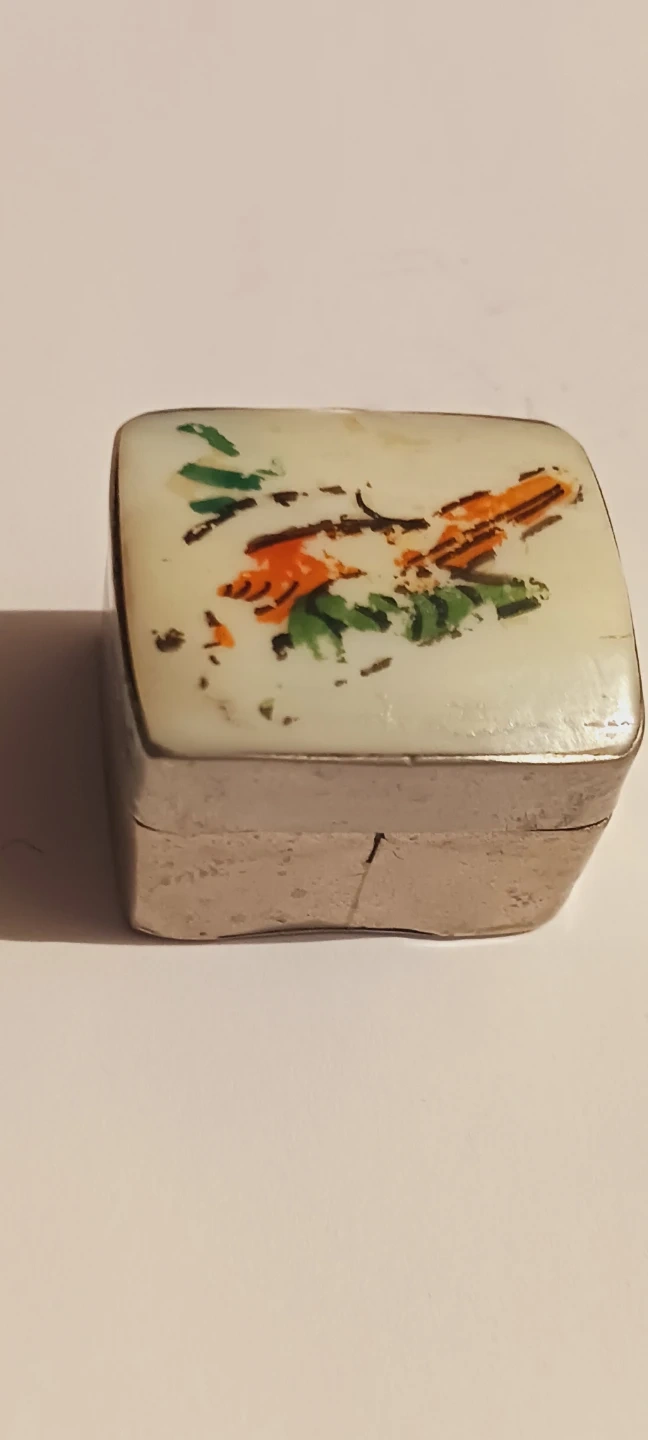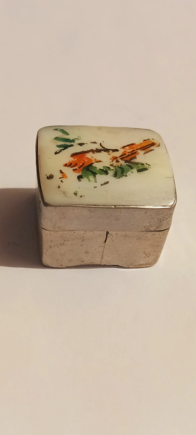 Sterling Silver 925 vintage trinket box with a decorative bird and foliage design on the lid. It's made of sterling silver 925 with a porcelain or enamel top. The box has a hinged lid and a rectangular base. 1"×1"×1". Good condition. ALL MY PRICES ARE NEGOTIABLE !!