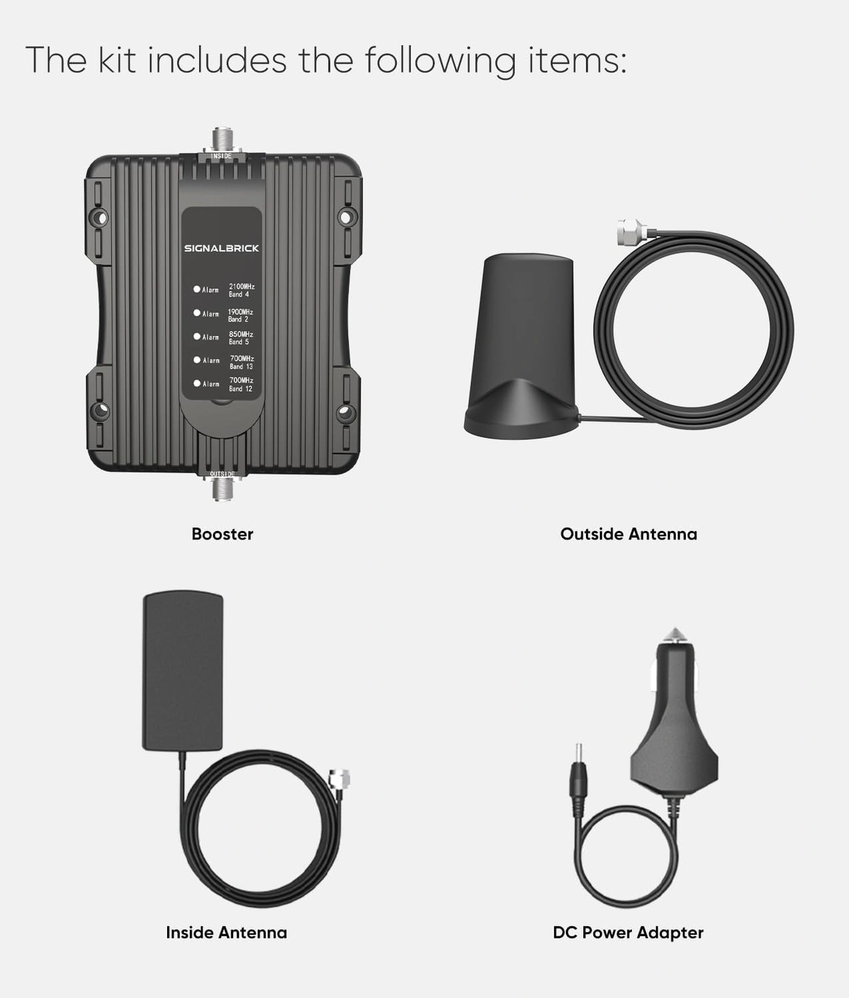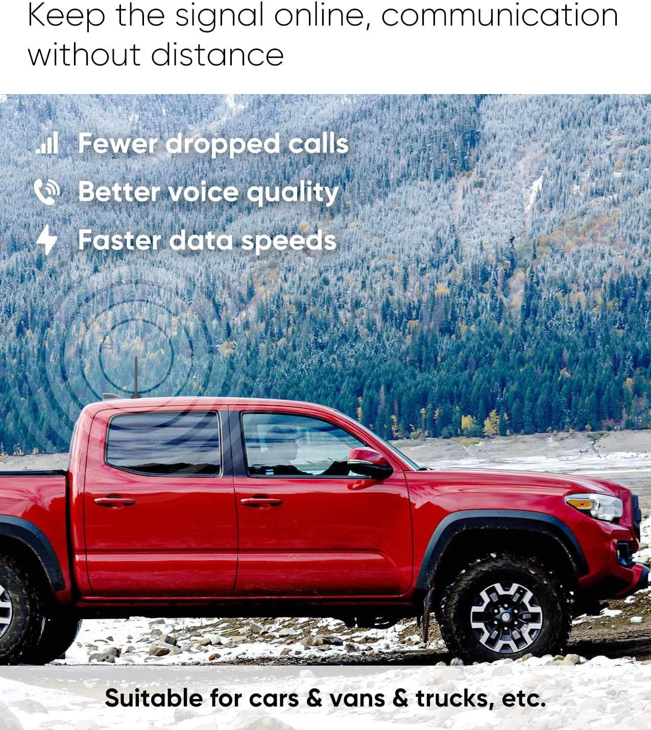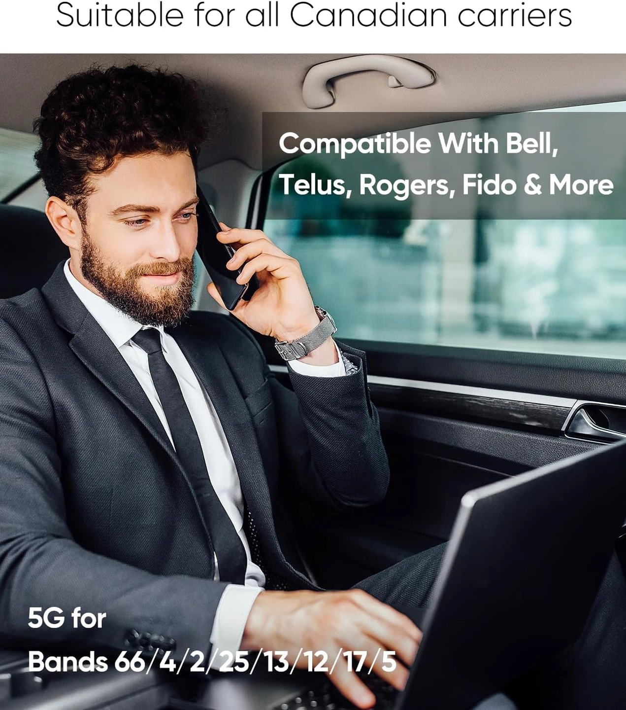 Suitable for cars, vans, and trucks. It is compatible with all Canadian carriers and networks, including 5G/4G LTE 3G. It includes a booster, outside antenna, inside antenna, and a DC power adapter.