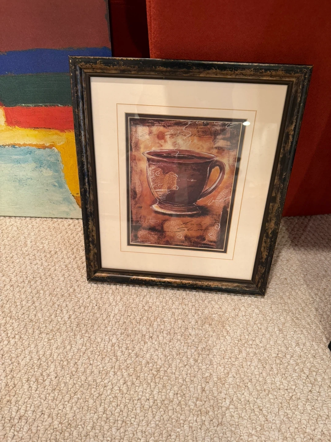 Framed print featuring a steaming coffee cup. The art has a warm, earthy tone with subtle script details. It's housed in a dark, distressed frame. This piece would add a cozy touch to any kitchen or dining area!