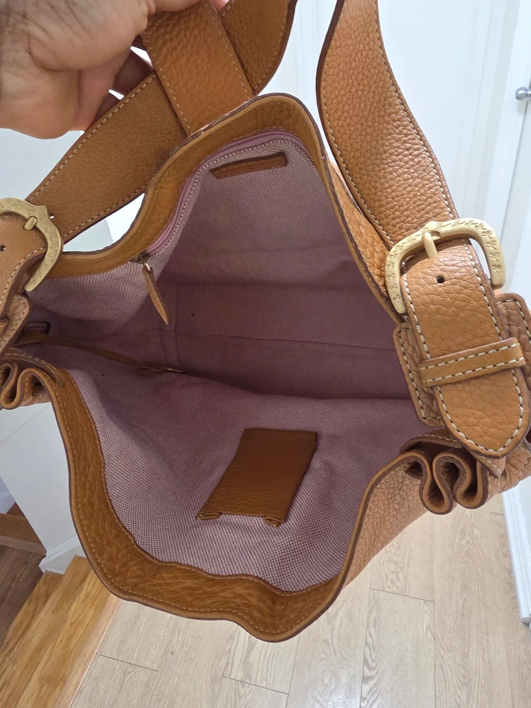 Authentic rare vintage find Brown pebbled leather Dooney & Bourke handbag. It has a buckle closure and adjustable strap. Interior has a zippered pocket and a small leather tag...comes with the original dust bag...NEVER USED.