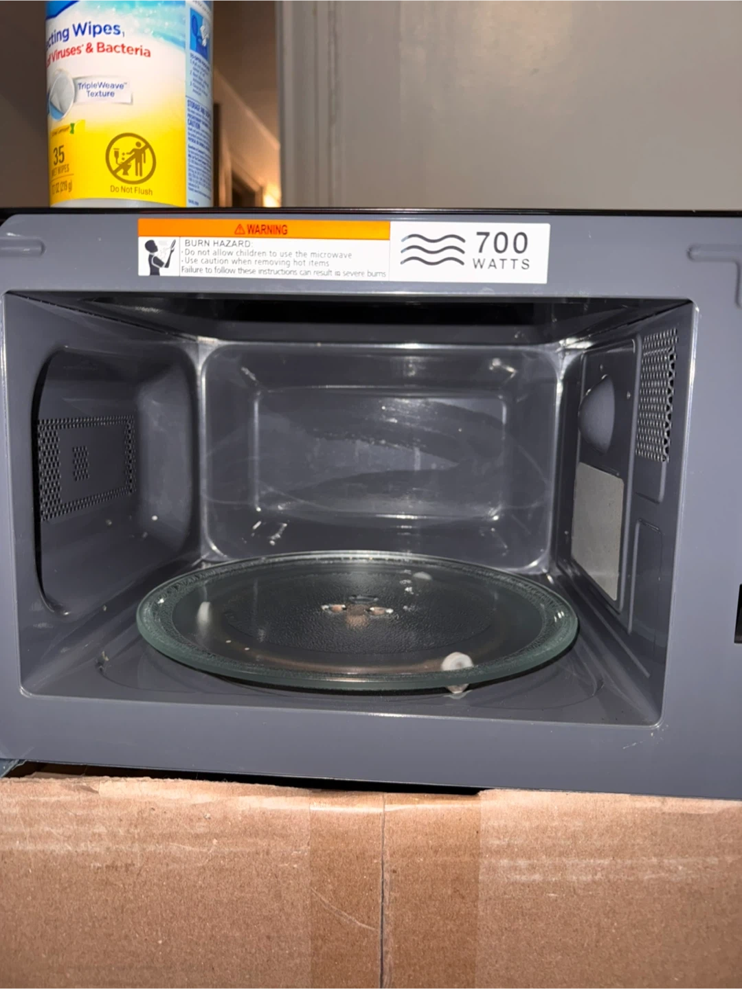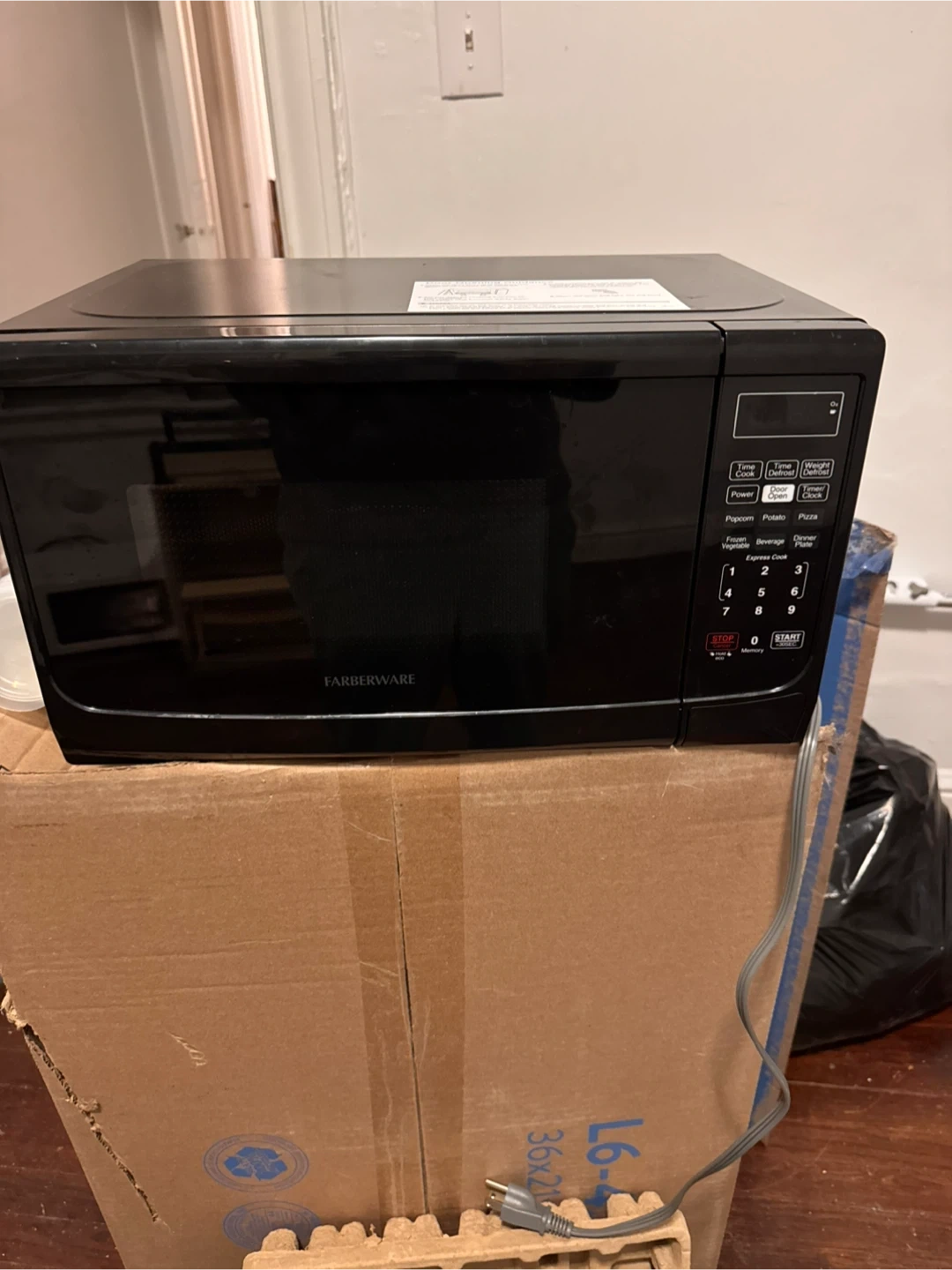 This is a black Farberware microwave oven. It features a 700-watt power capacity. The interior includes a glass turntable. PICK UP ASAP - ADDRESS 239 E 242nd IN THE BRONX.